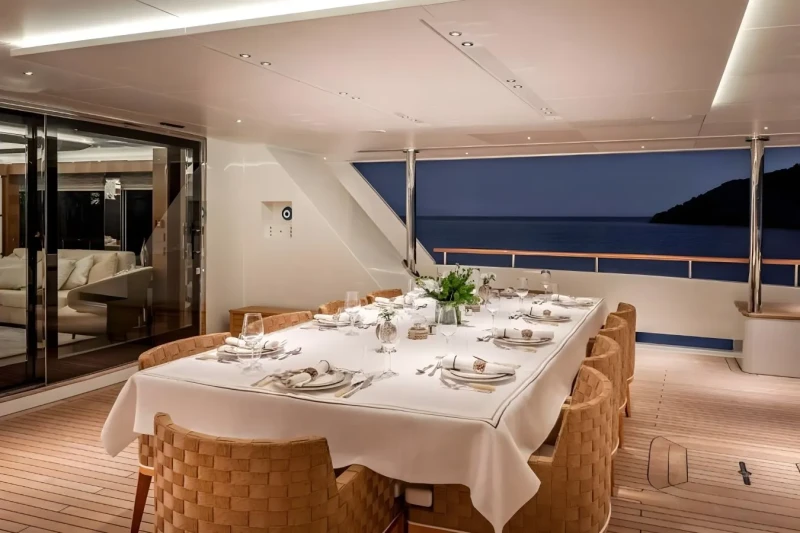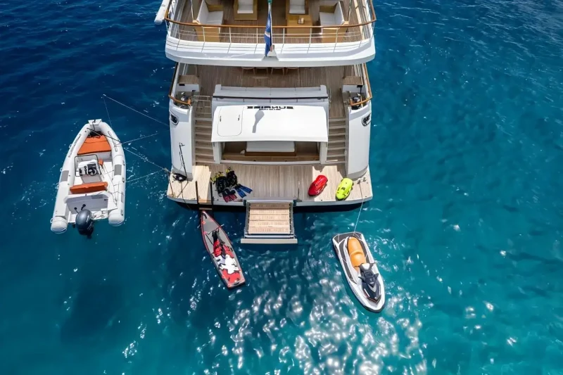 She comfortably accommodates up to 12 guests across 5 staterooms, including 1 master suite on the upper deck with private access and mesmerizing panoramas overlooking the aft deck. The rest of the staterooms (2 VIP staterooms and 2 twin cabins with 2 Pullman berths) are situated on the lower deck. Adorned in Macassar ebony, honey afzelia woodwork with a fusion of woven leather and bespoke detailing throughout, this luxury motor yacht imbues contemporary elegance at every turn.