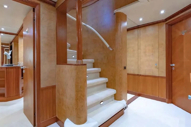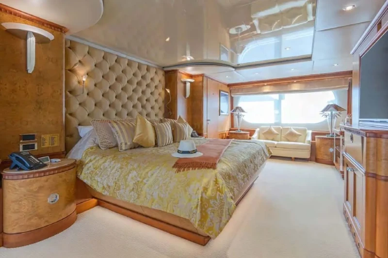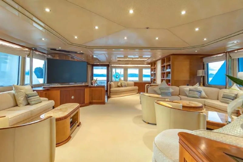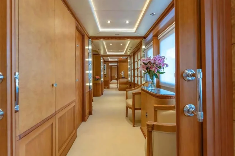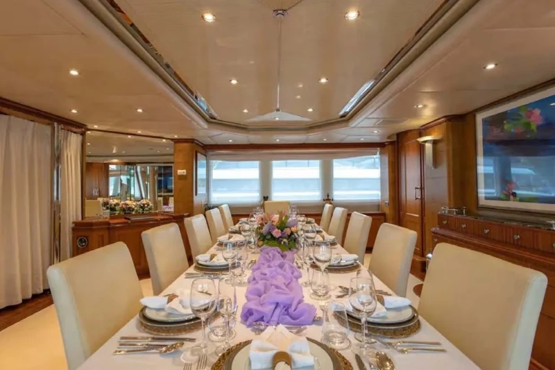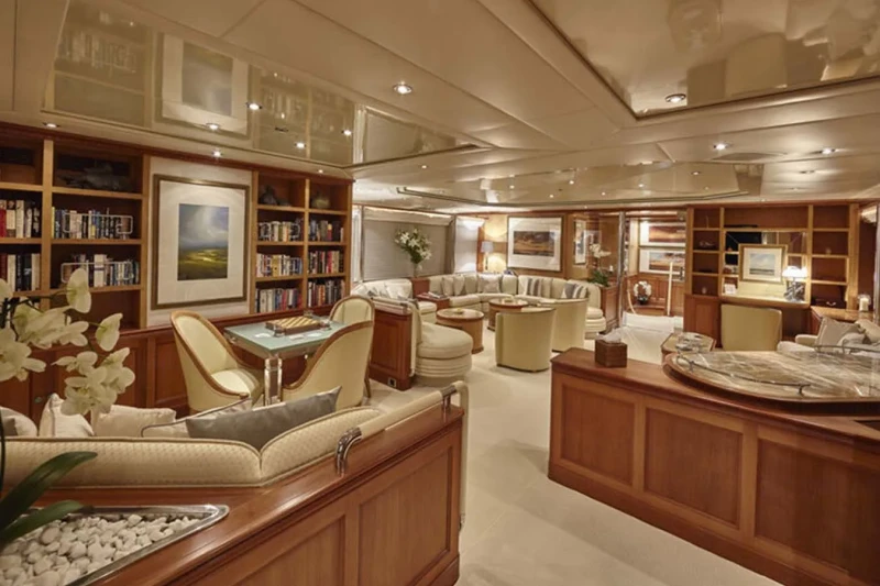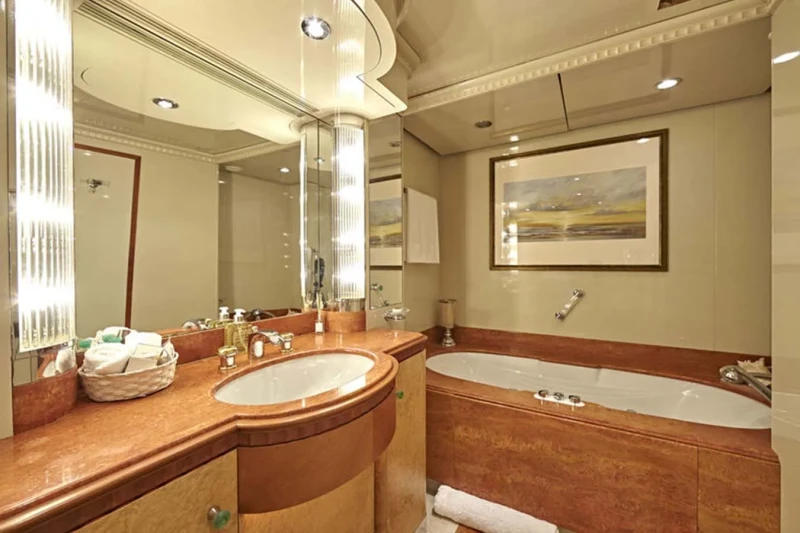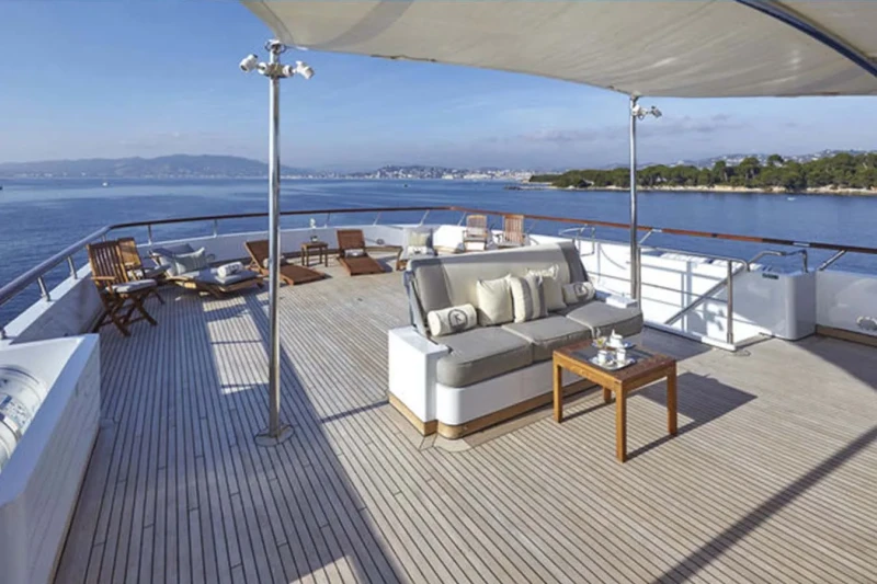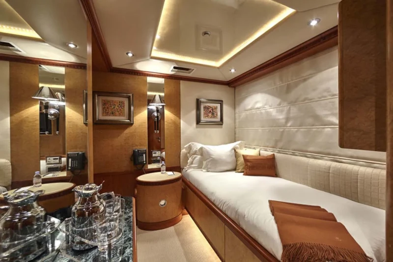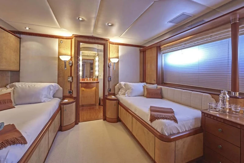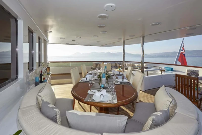 Azul V is great for families thanks to her child-friendly setup. Built in 1996, She offers guest accommodation for up to 12 guests with a layout comprising a master suite, one VIP cabin, one double cabin, two twin cabins and one single cabin. The supremely spacious full beam master suite incorporates its own study and dressing room as well as a his and her bathroom. There are 8 beds in total, including 2 king, 1 queen, 1 double, 5 singles and 2 pullmans. She is also capable of carrying up to 11 crew onboard to ensure a relaxed luxury yacht charter experience.