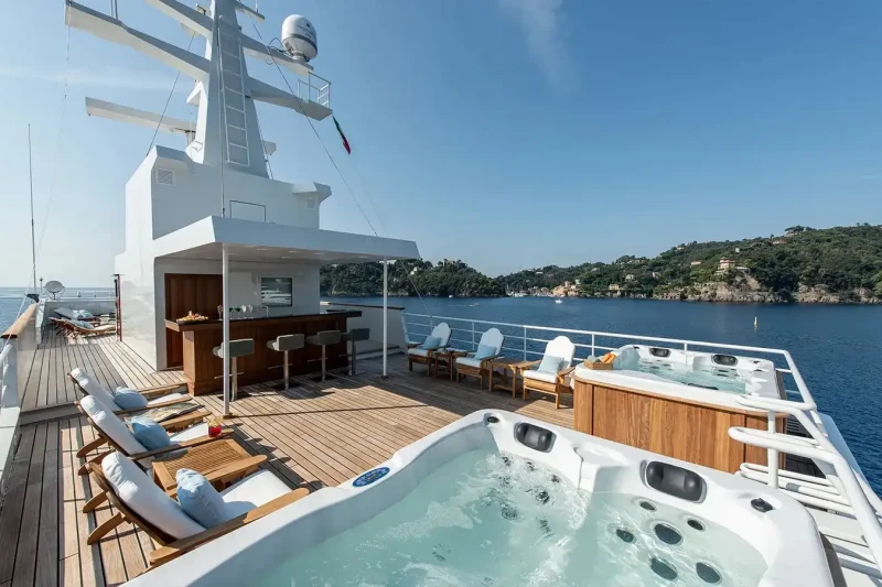 On your charter, you'll find plenty to keep you busy and entertained including a state-of-the-art movie theatre for movie nights. Visit the sauna and disconnect in peace and quiet plus make your day truly exceptional at the beach club. A gym with all the latest equipment is available for a good work out or elsewhere, retreat to the deck jacuzzi and soak up the scenery.