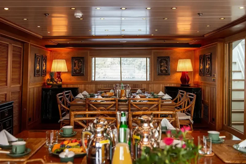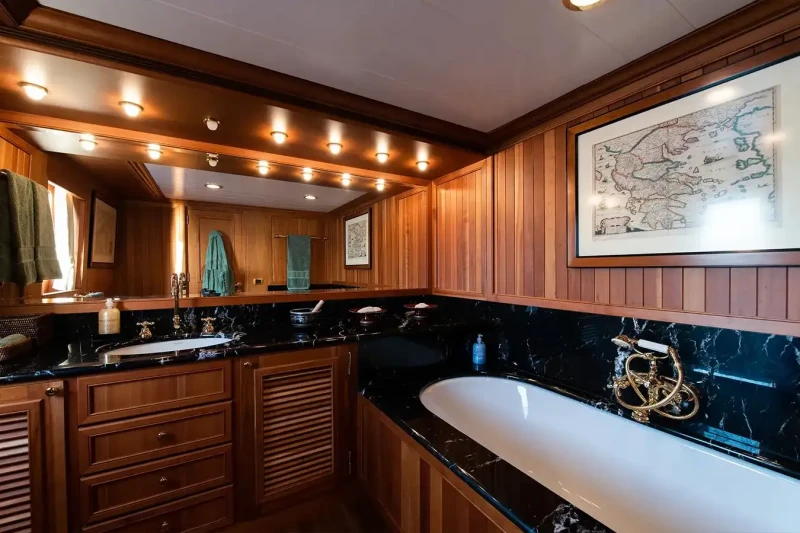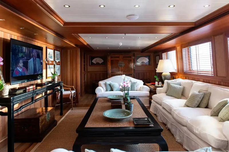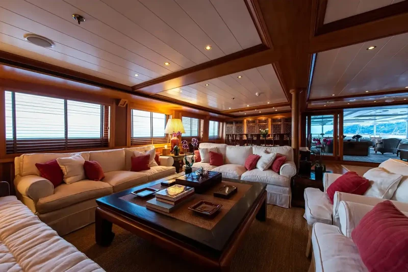 Bleu De Nimes is great for families thanks to her child-friendly setup. She offers guest accommodation for up to 28 guests with a layout comprising a master suite, two VIP cabins, six double cabins and two twin cabins. The supremely spacious full beam master suite incorporates its own study and dressing room as well as a his and her bathroom. There are 19 beds in total, including 4 king, 5 doubles, 8 singles and 2 pullmans. Additionally, there are 12 staff cabins aboard. She is also capable of carrying up to 23 crew onboard to ensure a relaxed luxury yacht charter experience.
