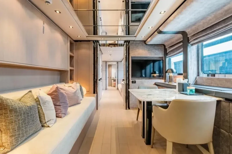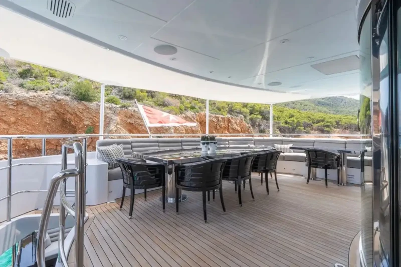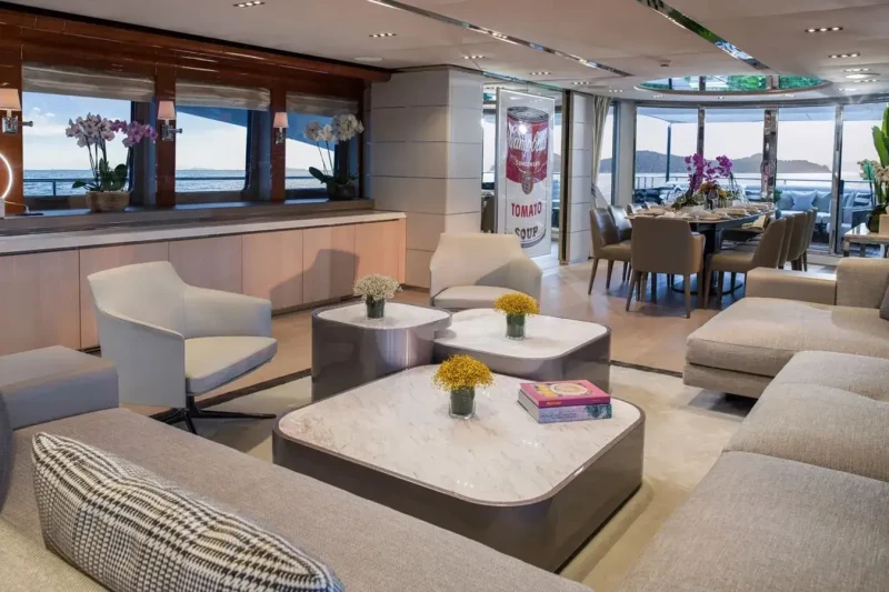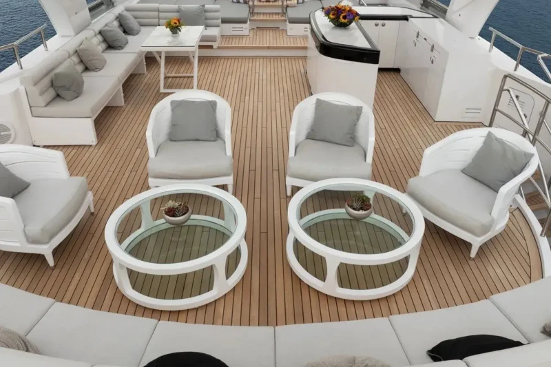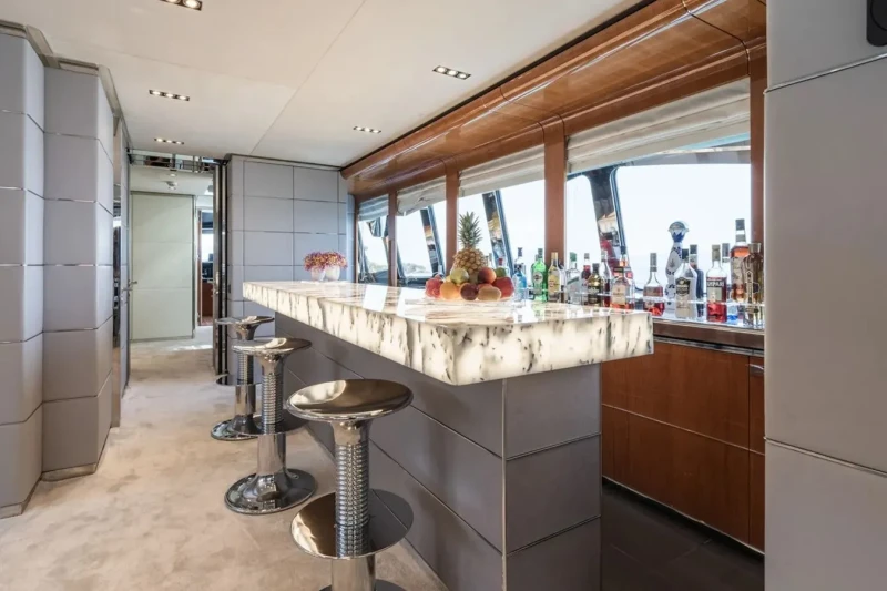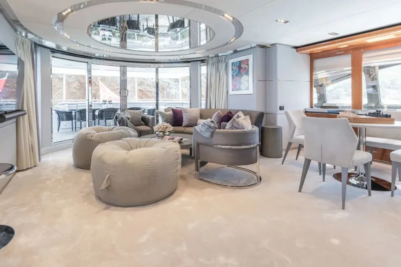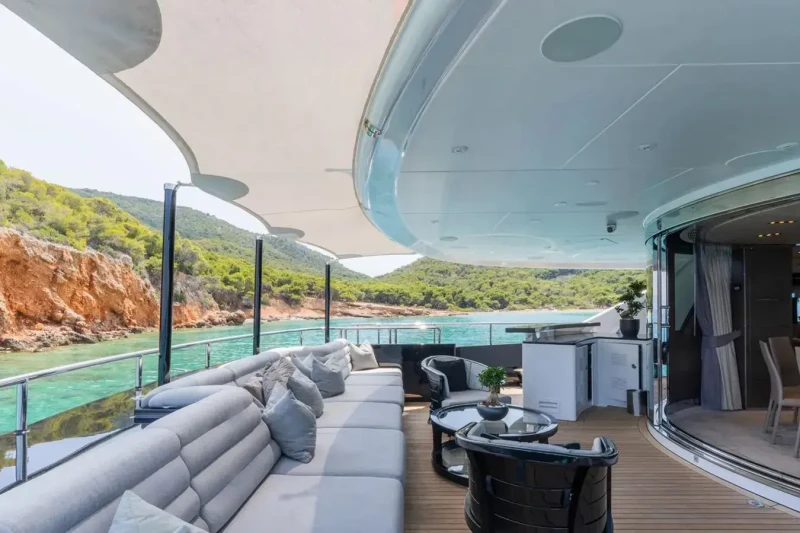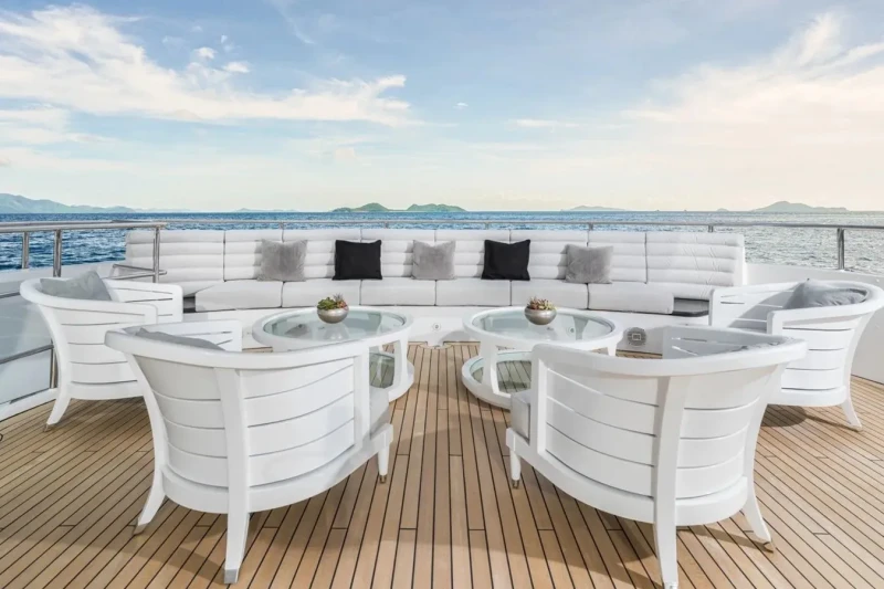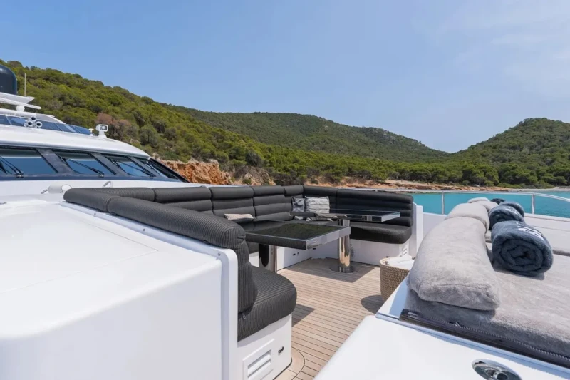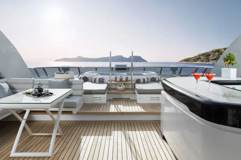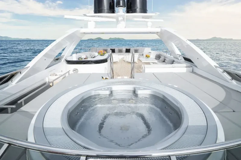 Keeping comfortable and entertained on Bliss is easy thanks to the available amenities such as a sauna to help you detox and regenerate. Even the most discerning of charter guests will enjoy the included beach club or elsewhere, maintain your fitness routine and work out in the well-equipped gym. Retreat to the deck jacuzzi and soak up the scenery.