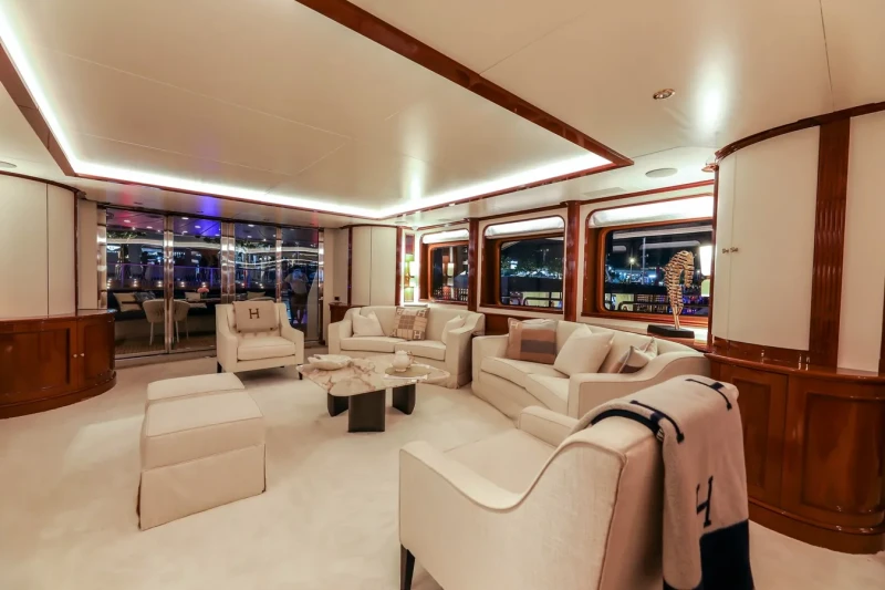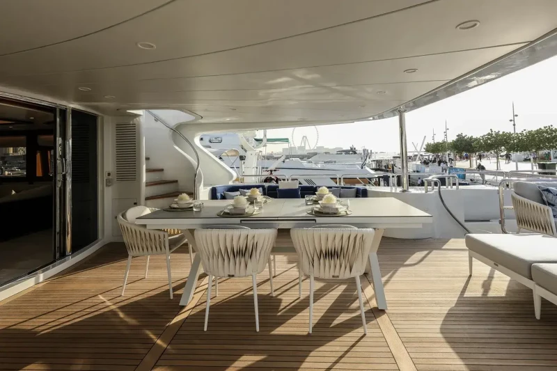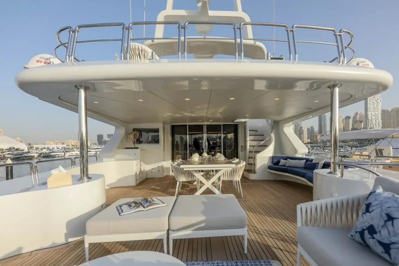 A charter on DXB is comfortable and convenient thanks to the provided amenities, notably a deck jacuzzi, perfect to enjoy the scenery with your favourite drink in hand.