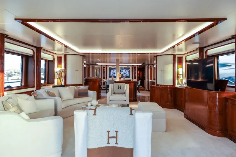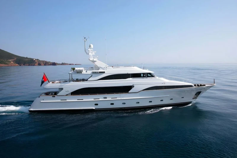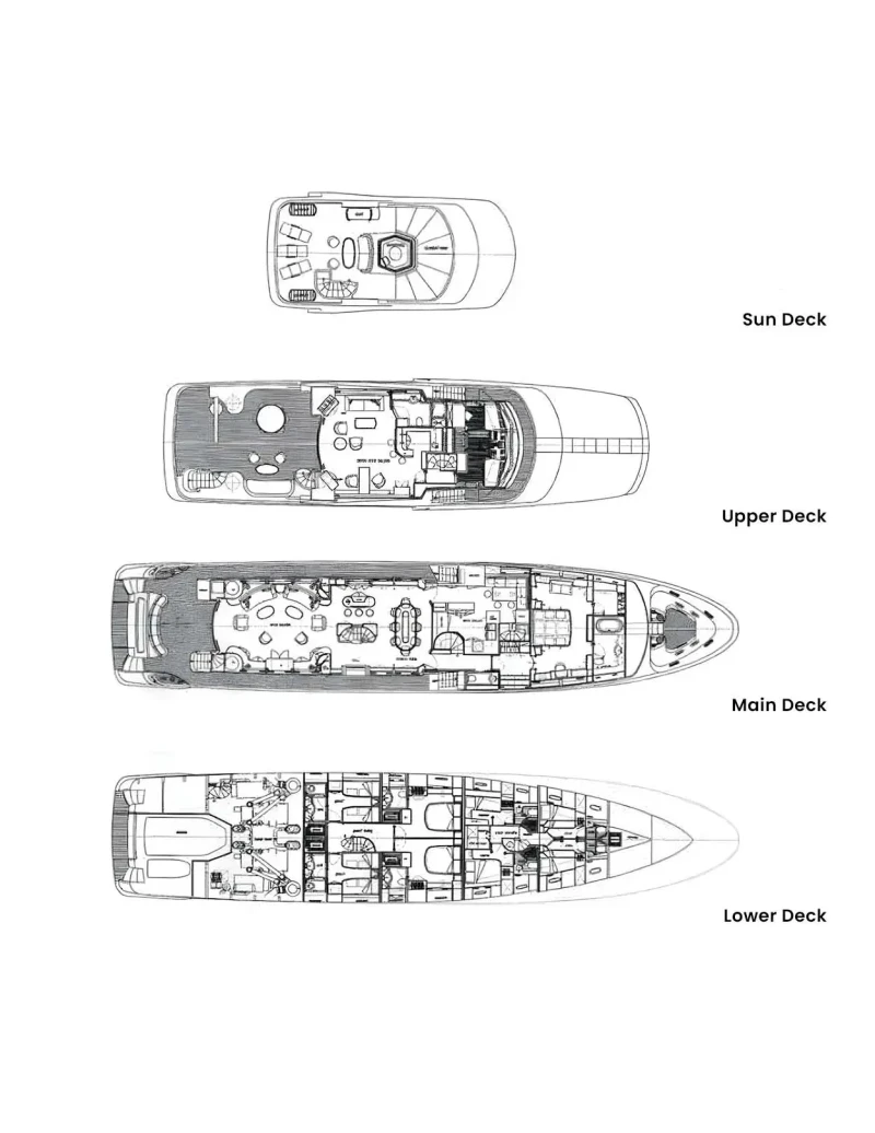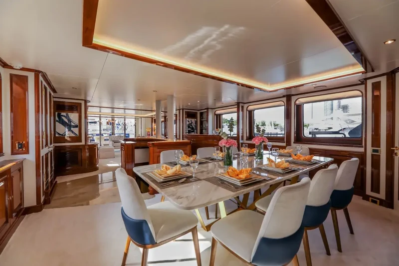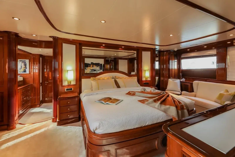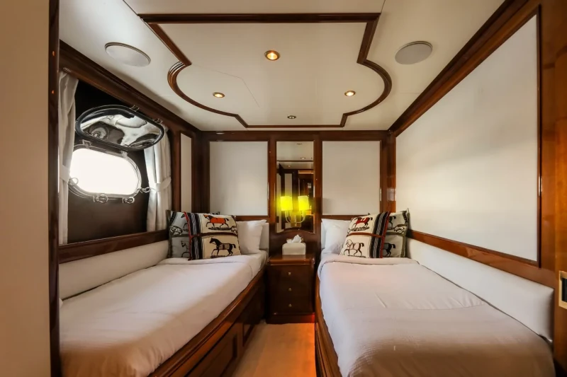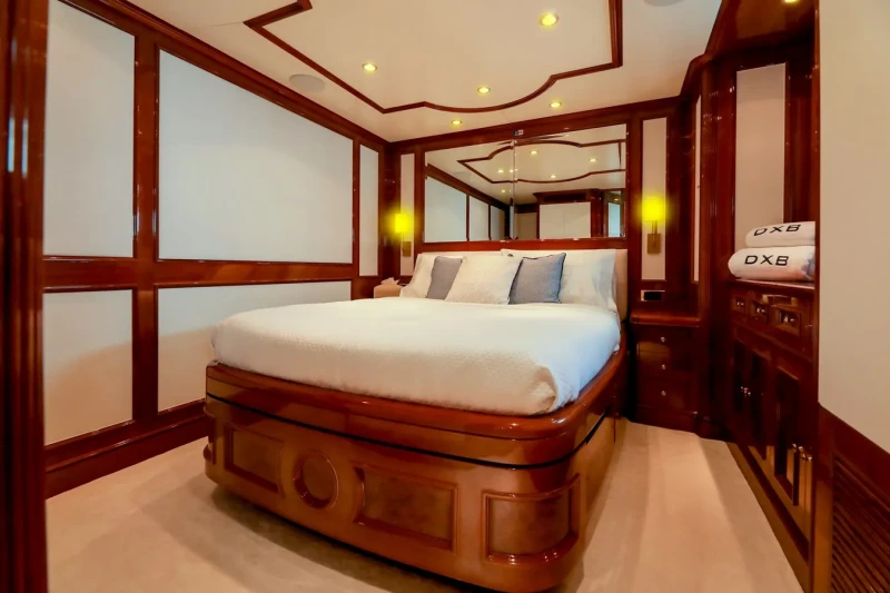DXB offers guest accommodation for up to 10 guests in 5 suites comprising a master suite, two double cabins and two twin cabins. There are 7 beds in total, including 1 king, 2 queen, 2 doubles and 4 singles. She is also capable of carrying up to 7 crew onboard to ensure a relaxed luxury yacht charter experience.