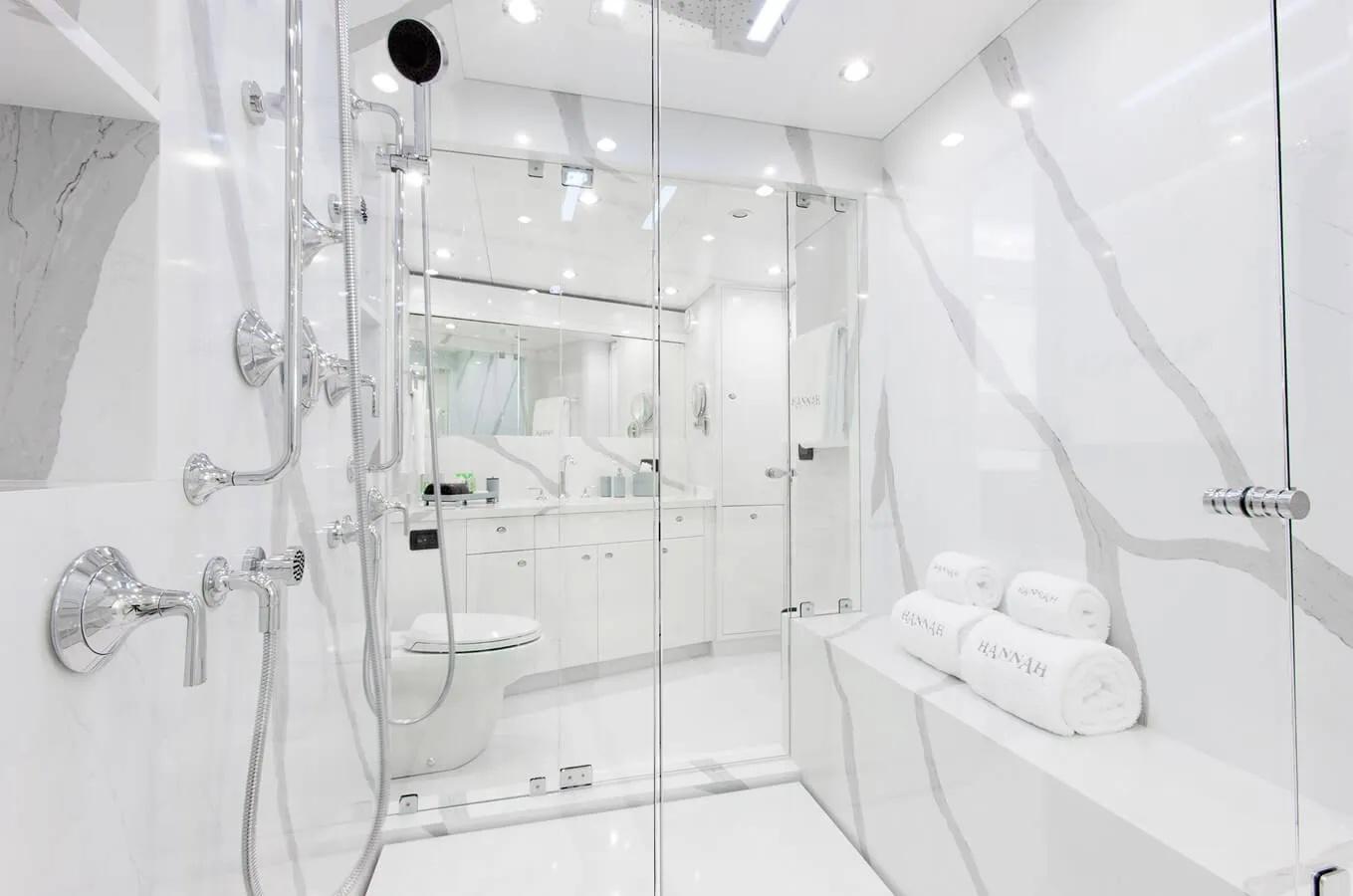 Built in 2003, Hannah offers guest accommodation for up to 8 guests in 4 suites comprising a master suite, one VIP cabin and three twin cabins. The supremely spacious full beam master suite features extensive storage space provided by the dressing room benefits from a his and her bathroom. There are 8 beds in total, including 1 king, 1 queen and 6 singles. She is also capable of carrying up to 5 crew onboard to ensure a relaxed luxury yacht charter experience.