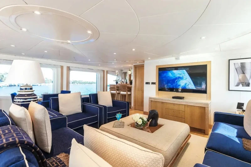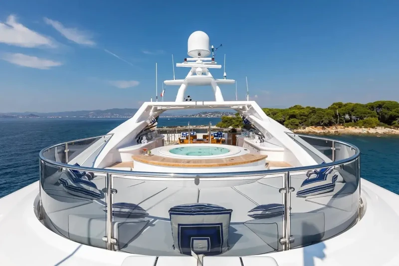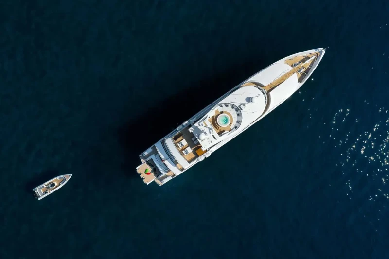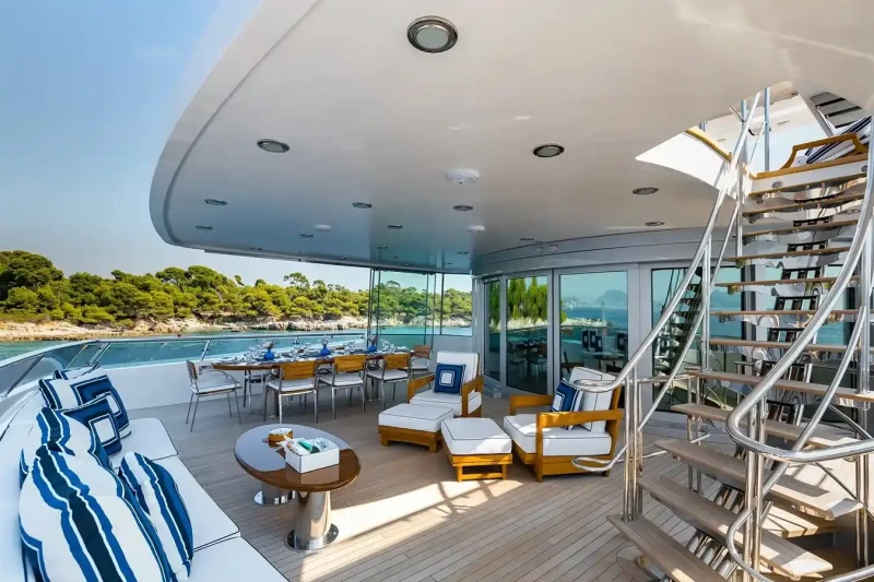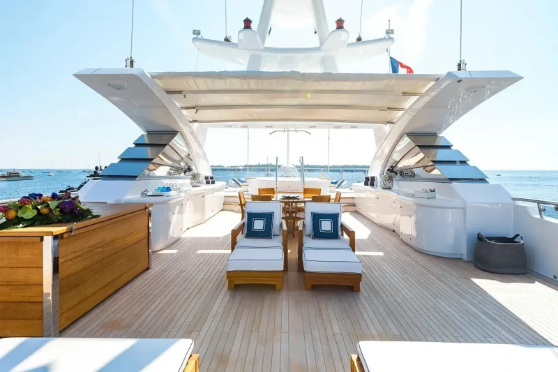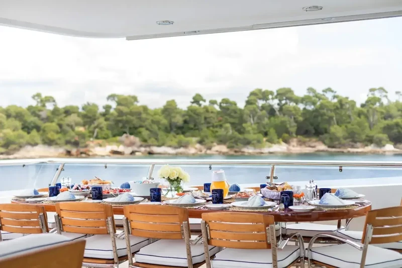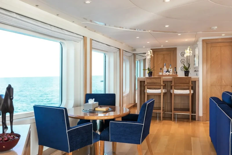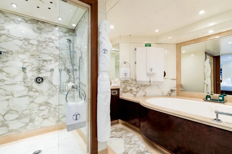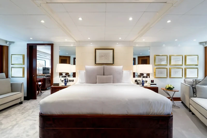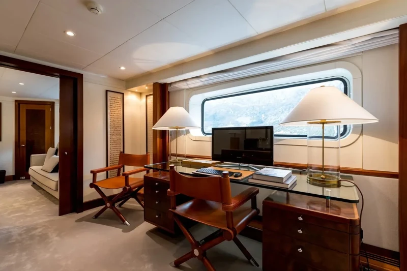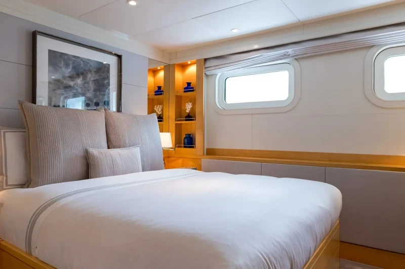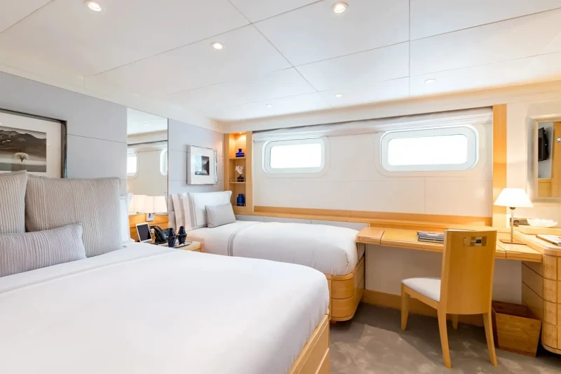 Built in 2001, La Tania offers guest accommodation for up to 11 guests in 5 suites comprising a master suite located on the main deck, two double cabins and one twin cabin. The supremely spacious full beam master suite incorporates its own study. There are 6 beds in total, including 3 doubles and 3 singles. She is also capable of carrying up to 12 crew onboard to ensure a relaxed luxury yacht charter experience.