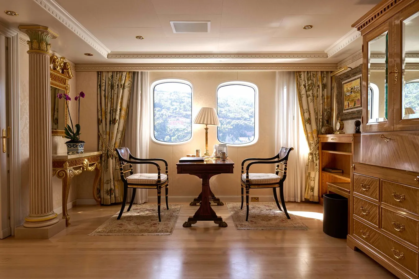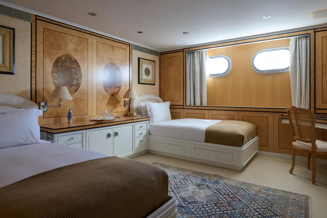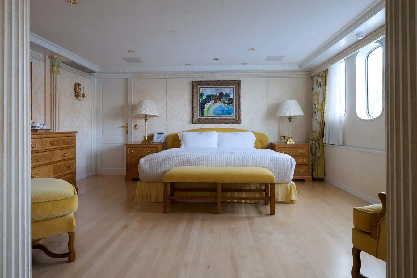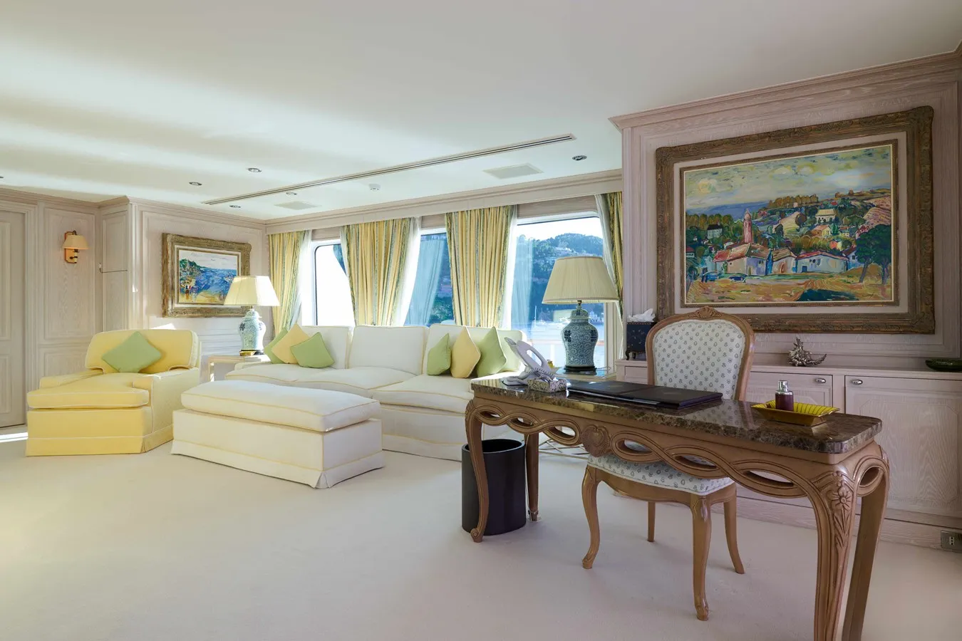 Lady Beatrice has been designed to comfortably accommodate up to 16 guests in 8 suites comprising one VIP cabin. The master suite incorporates its own study and dressing room. She is also capable of carrying up to 17 crew onboard to ensure a relaxed luxury yacht experience.