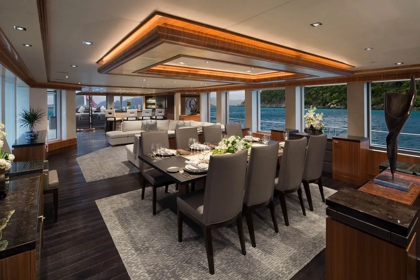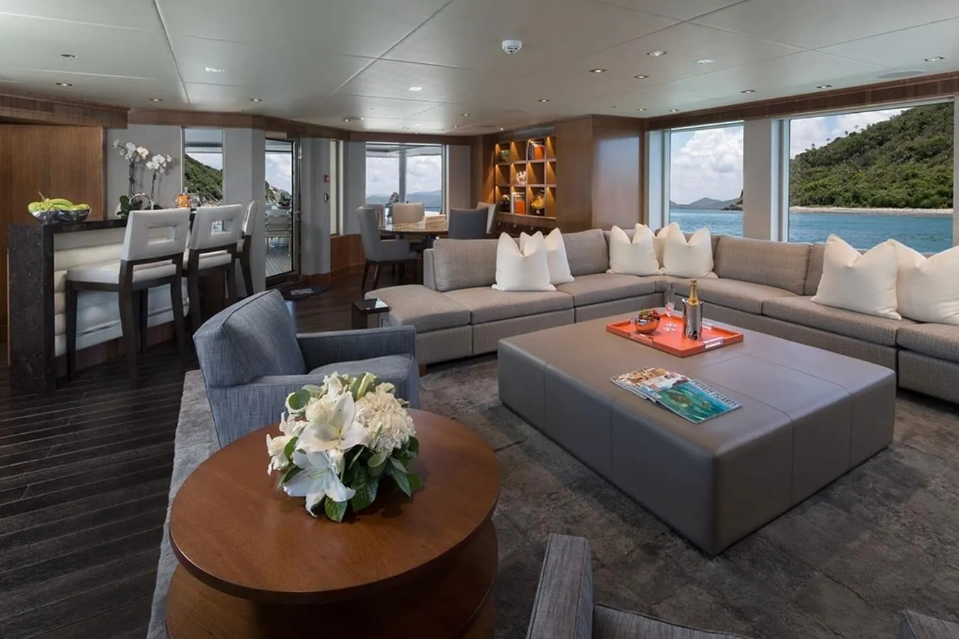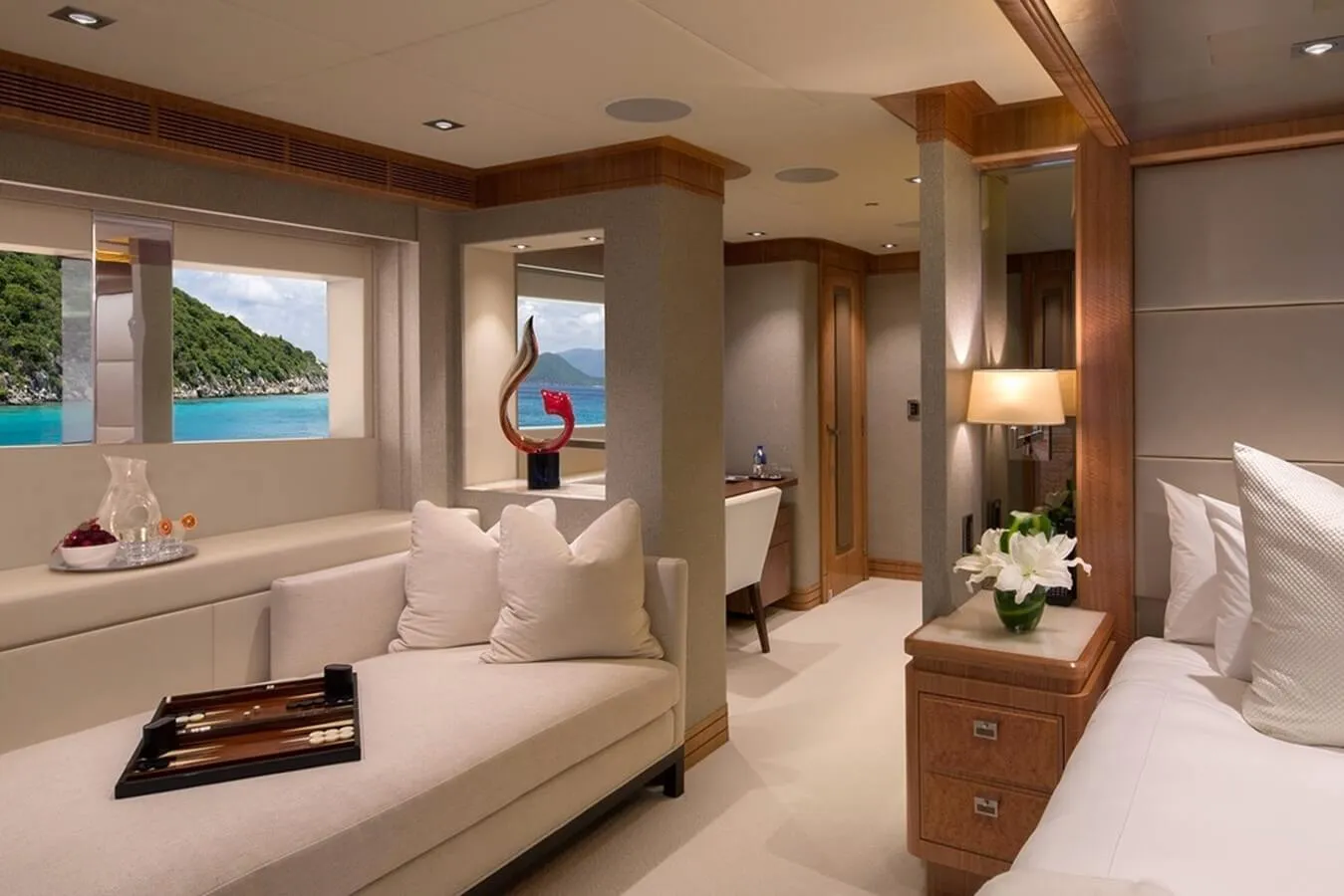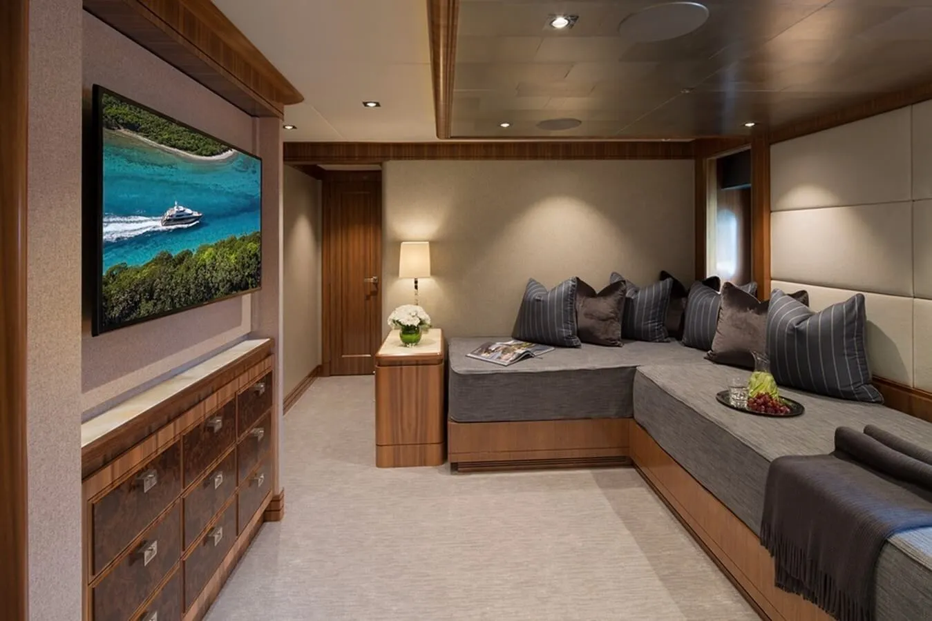 Muchos Mas is great for families thanks to her child-friendly setup. Built in 2016, She offers guest accommodation for up to 10 guests with a layout comprising a master suite, two double cabins and two cabins that can operate as twins or doubles. The supremely spacious full beam master suite incorporates its own study. The bed configuration includes 3 king and 1 pullman. She is also capable of carrying up to 9 crew onboard to ensure a relaxed luxury yacht charter experience.