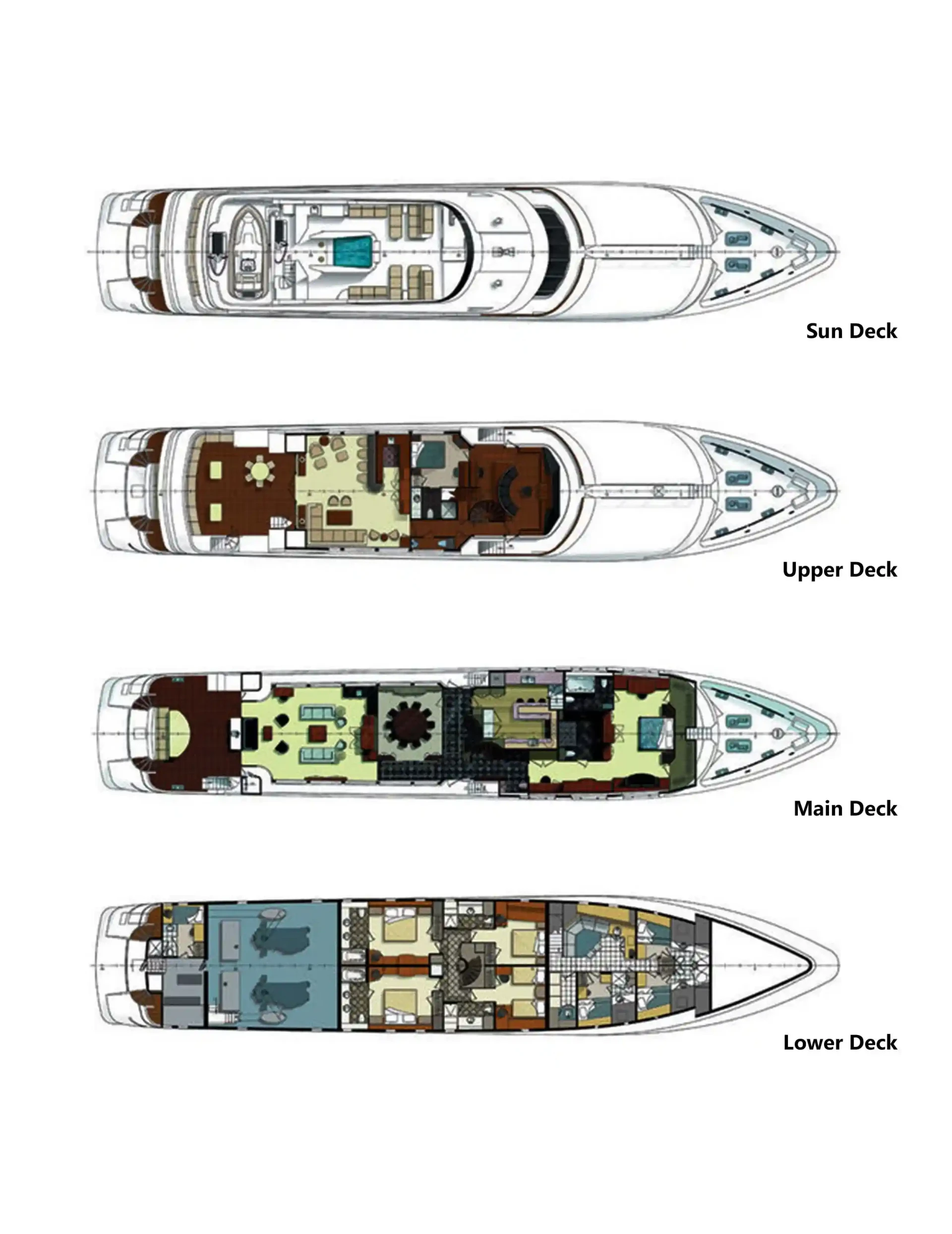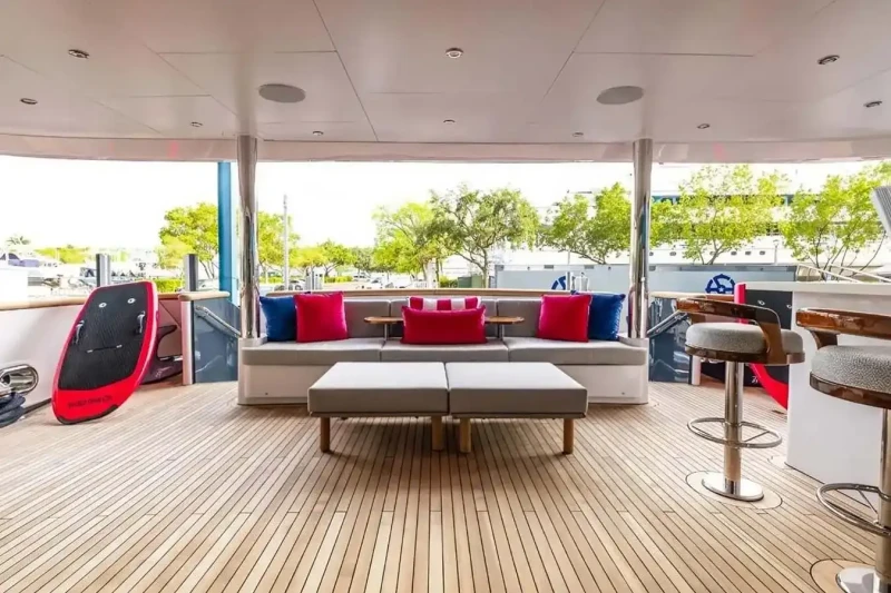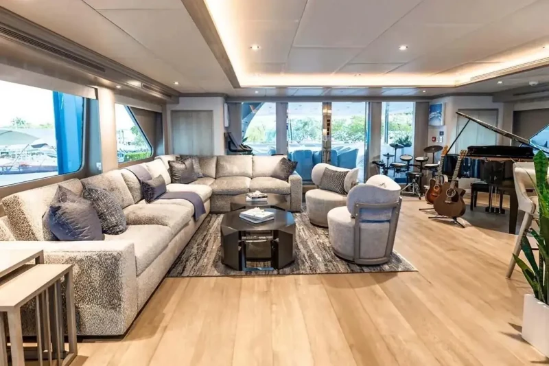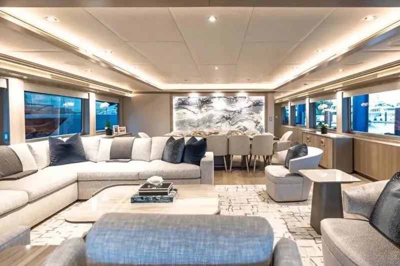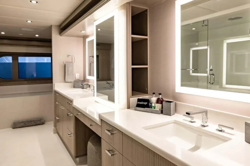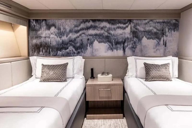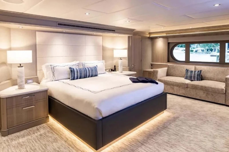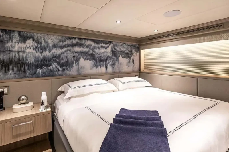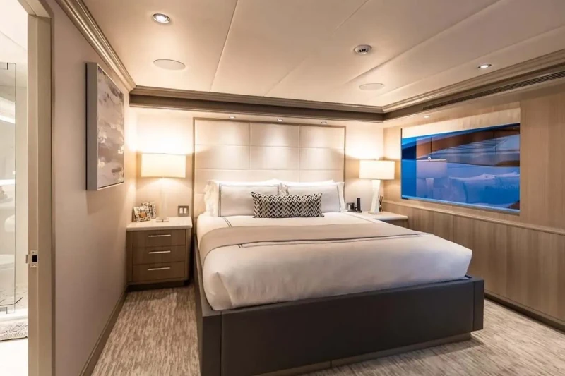 No Bad Ideas has been designed to comfortably accommodate up to 10 guests in 5 suites comprising two VIP cabins. The supremely spacious full beam master suite benefits from a his and her bathroom. She is also capable of carrying up to 10 crew onboard to ensure a relaxed luxury yacht experience.