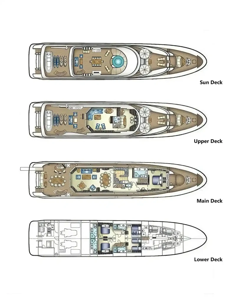 Serengeti is great for families thanks to her child-friendly setup. Built in 2002, She offers guest accommodation for up to 12 guests with a layout comprising a master suite located on the main deck, two double cabins and two twin cabins. There are 9 beds in total, including 3 king, 4 singles and 2 pullmans. She is also capable of carrying up to 7 crew onboard to ensure a relaxed luxury yacht charter experience.