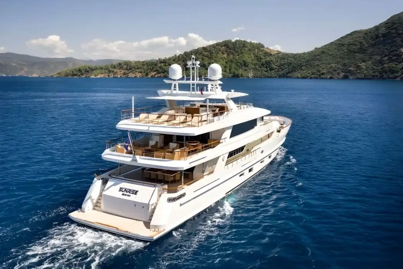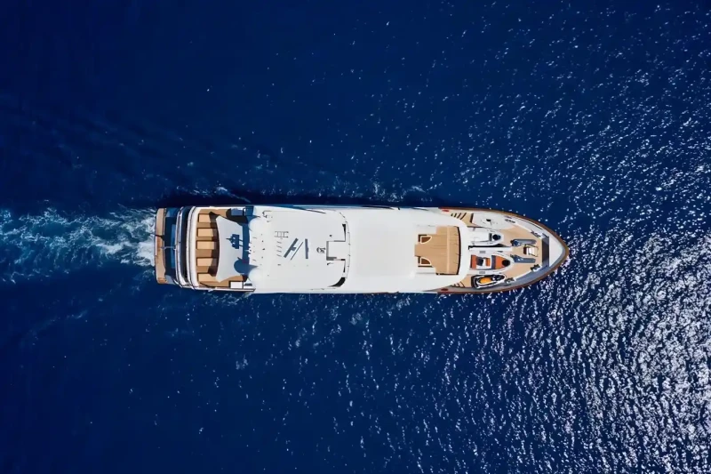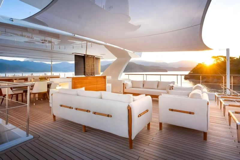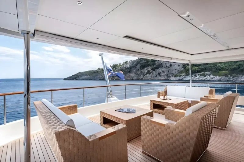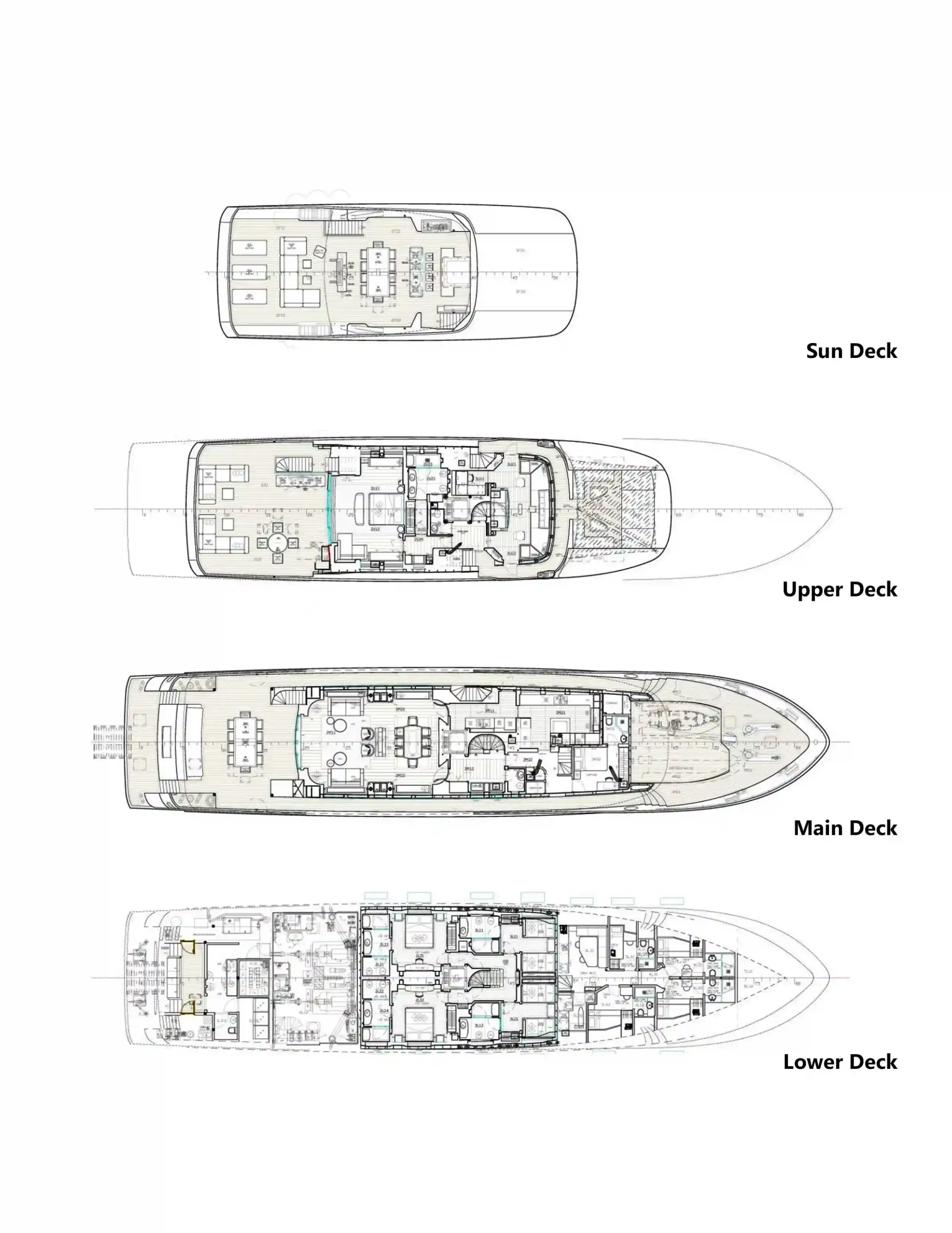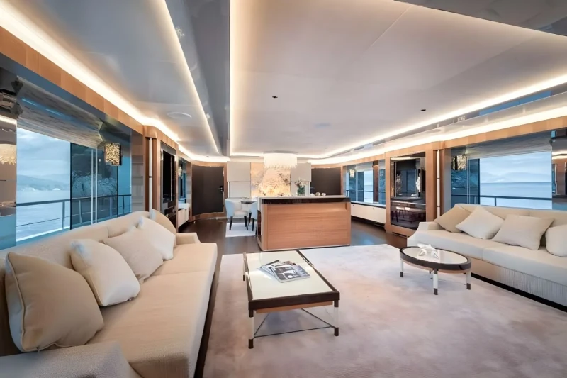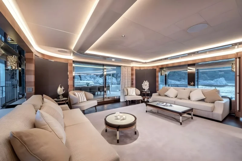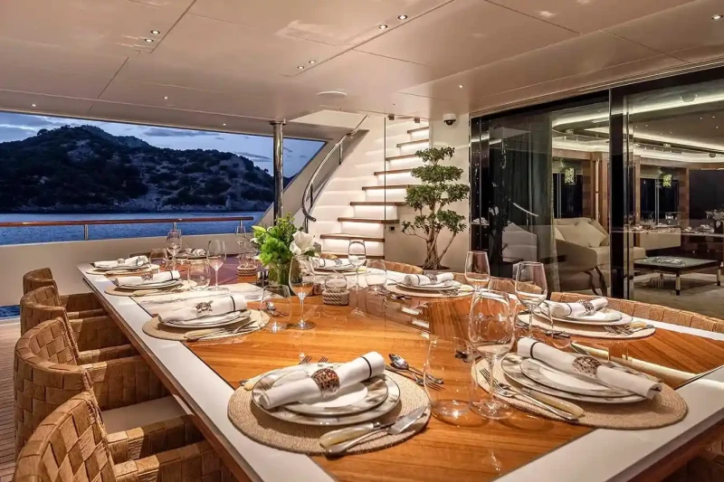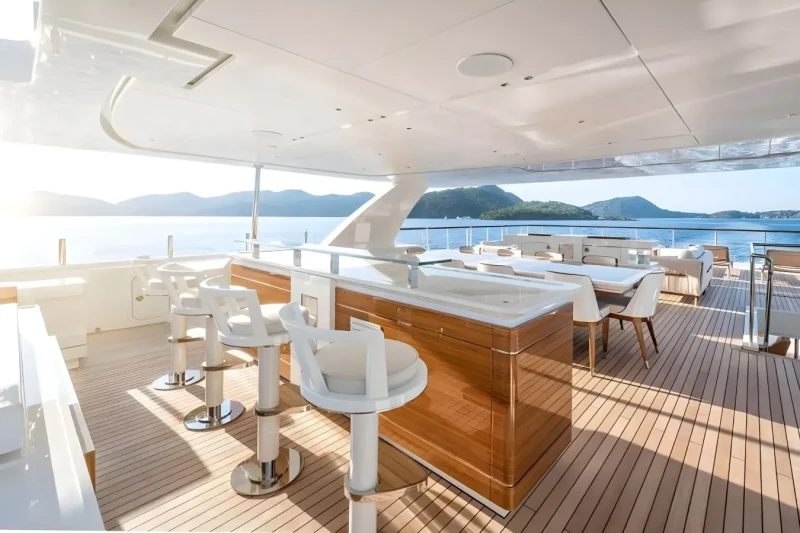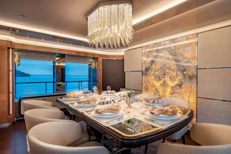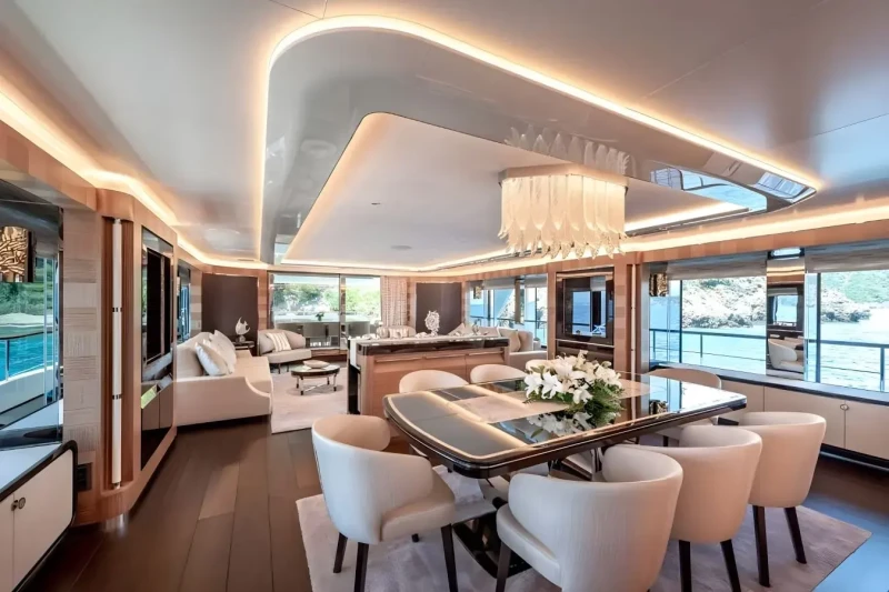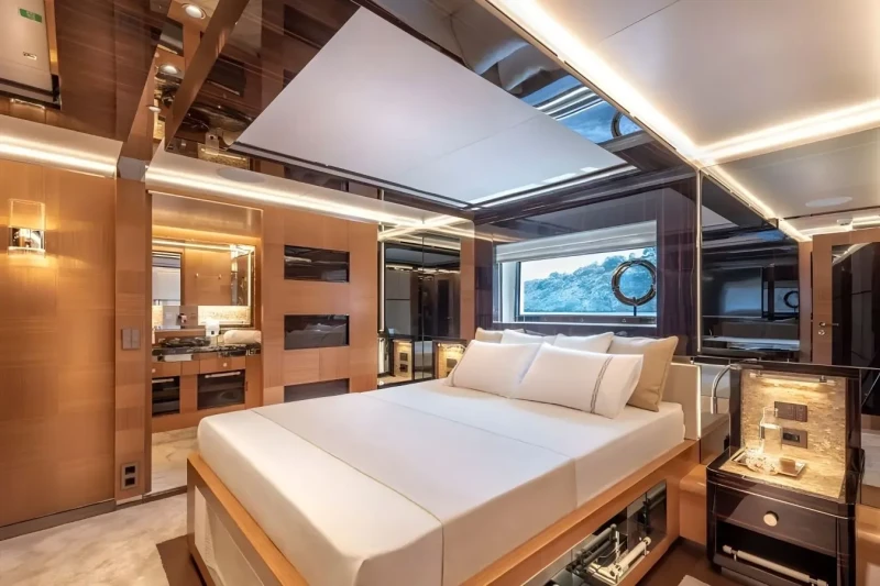 She comfortably accommodates up to 12 guests across 5 staterooms, including 1 master suite on the upper deck with private access and mesmerizing panoramas overlooking the aft deck. The rest of the staterooms (2 VIP staterooms and 2 twin cabins with 2 Pullman berths) are situated on the lower deck. Adorned in Macassar ebony, honey afzelia woodwork with a fusion of woven leather and bespoke detailing throughout, this luxury motor yacht imbues contemporary elegance at every turn.