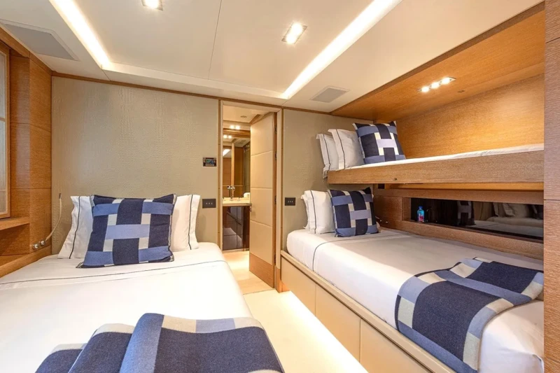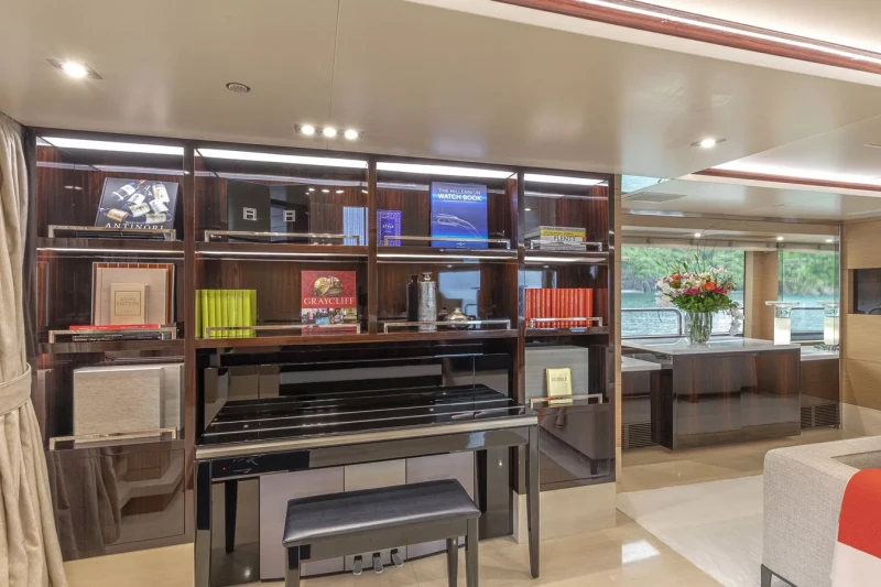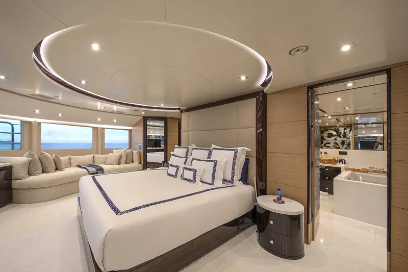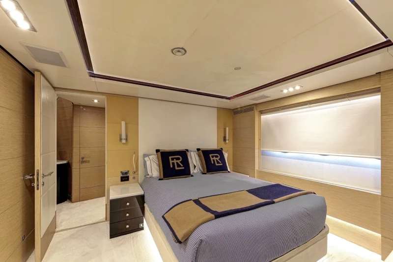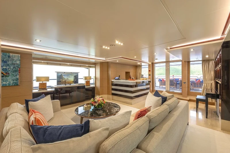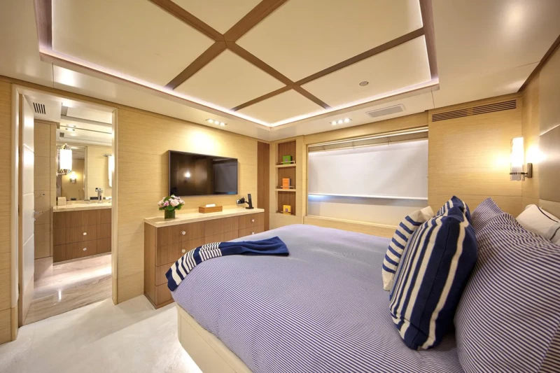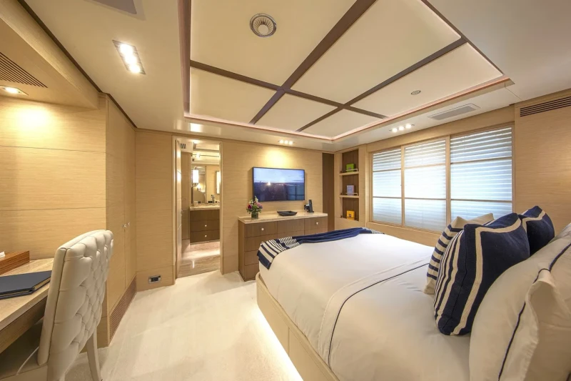 Hom offers guest accommodation for up to 12 guests in 5 suites comprising a master suite located on the main deck, one VIP cabin, one double cabin and two twin cabins. The supremely spacious full beam master suite incorporates its own study and dressing room as well as a his and her bathroom. The bed configuration includes 1 king, 3 doubles and 2 singles. She is also capable of carrying up to 10 crew onboard to ensure a relaxed luxury yacht charter experience.