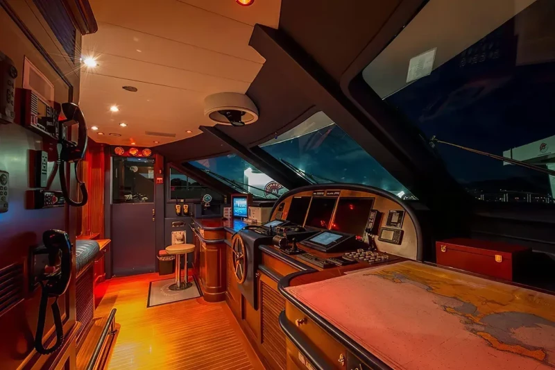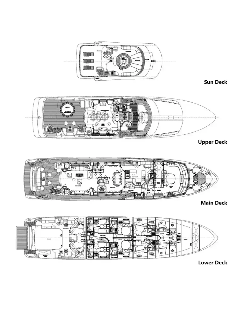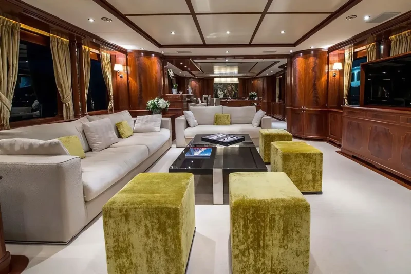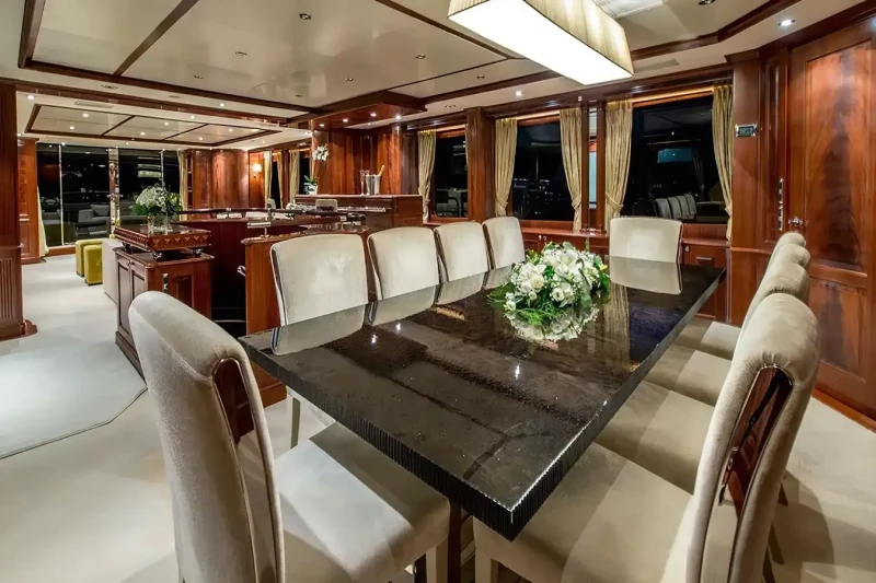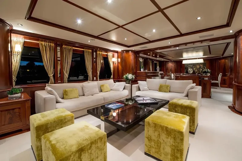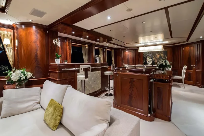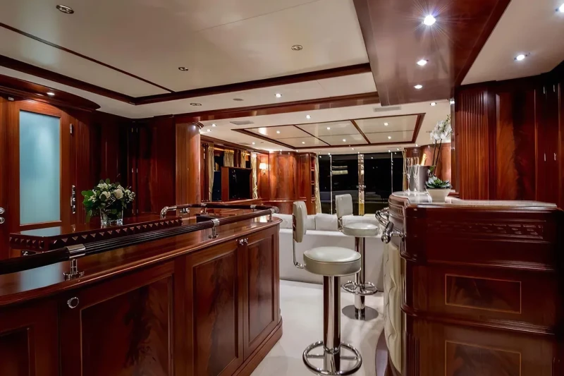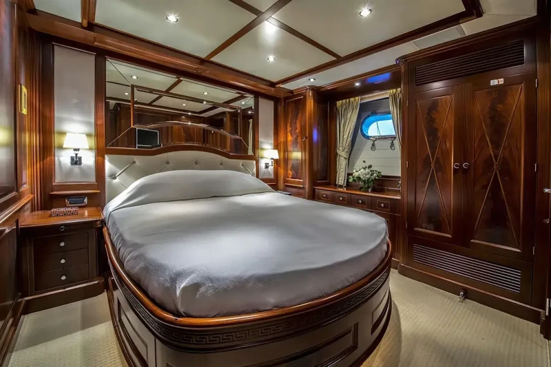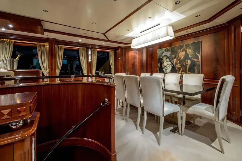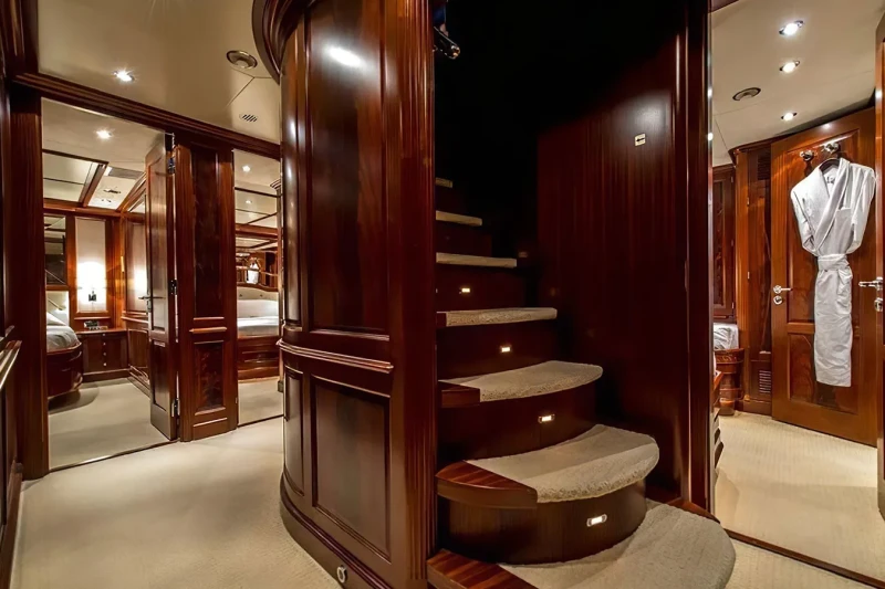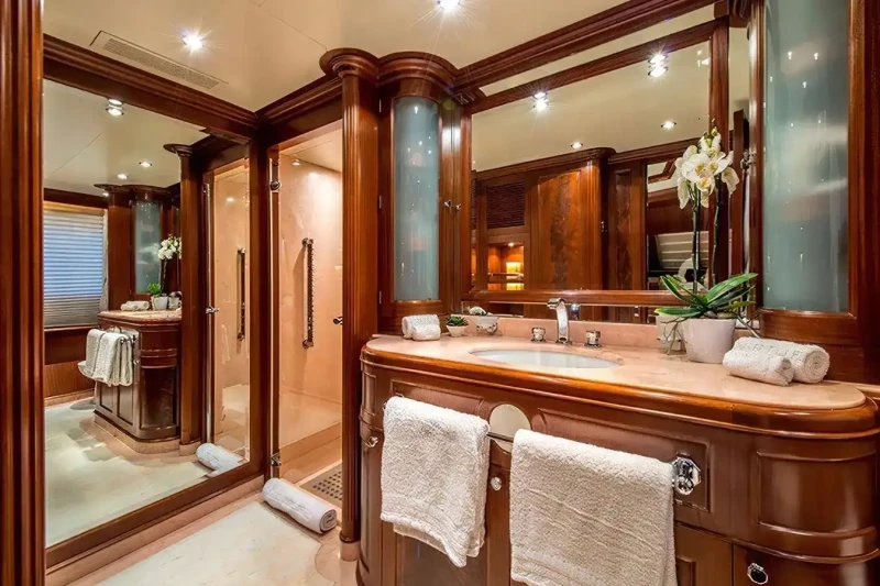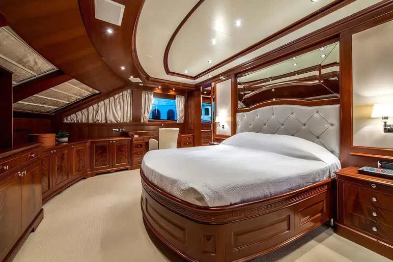 Virtue offers guest accommodation for up to 12 guests in 5 suites comprising a master suite located on the main deck, two double cabins and two twin cabins. The supremely spacious full beam master suite incorporates its own study. She is also capable of carrying up to 6 crew onboard to ensure a relaxed luxury yacht charter experience.