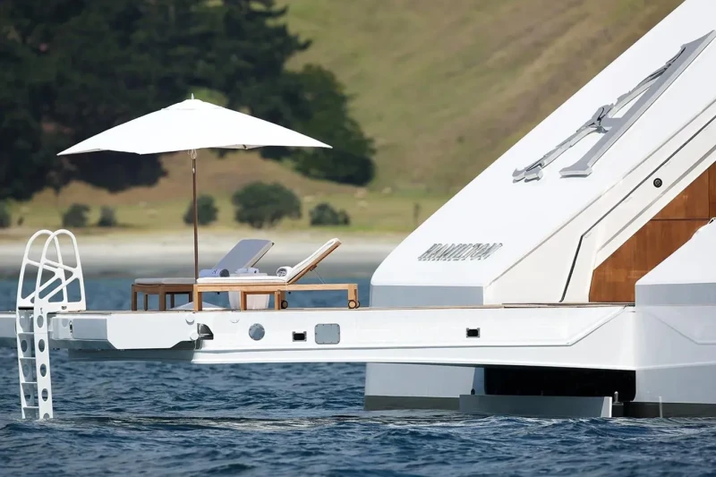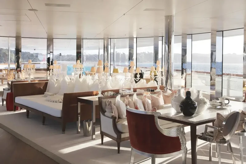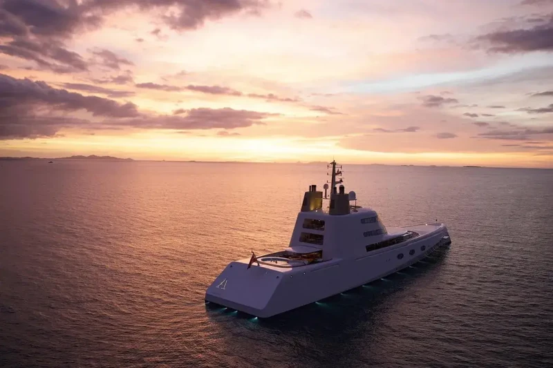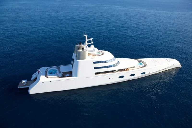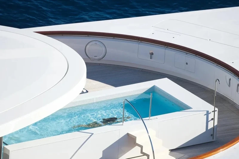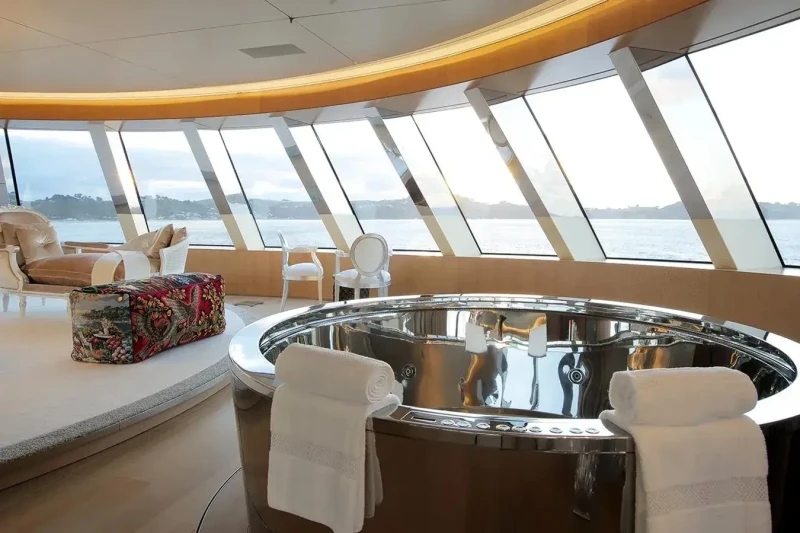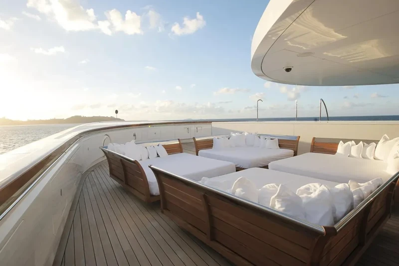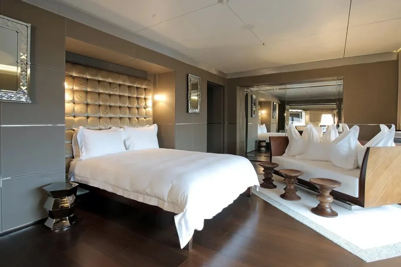 A has been designed to comfortably accommodate up to 14 guests in 7 suites. Additionally, there are 2 staff cabins aboard which can accommodate up to 4 members of the owners staff and security team. She is also capable of carrying up to 35 crew onboard to ensure a relaxed luxury yacht experience.