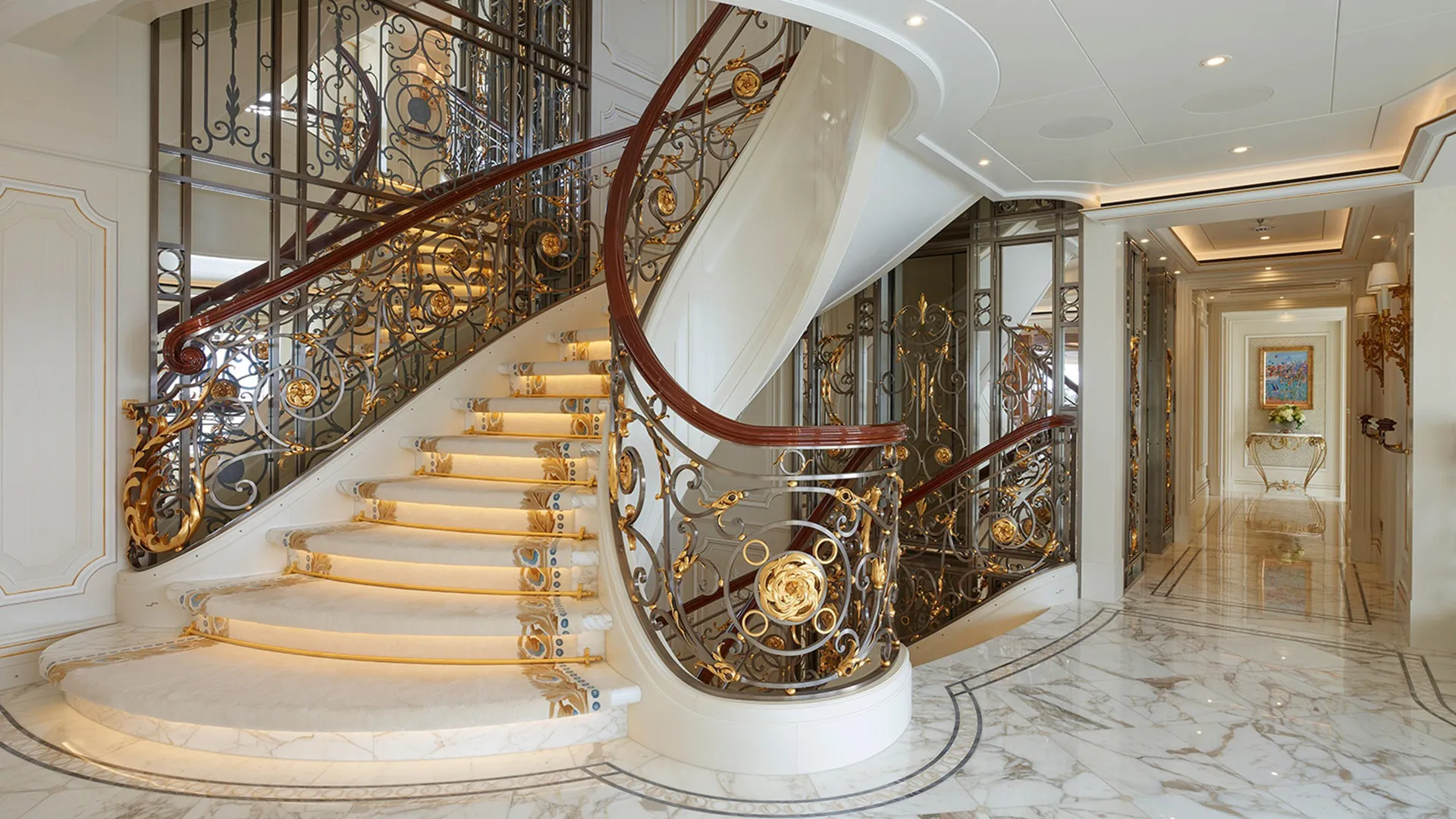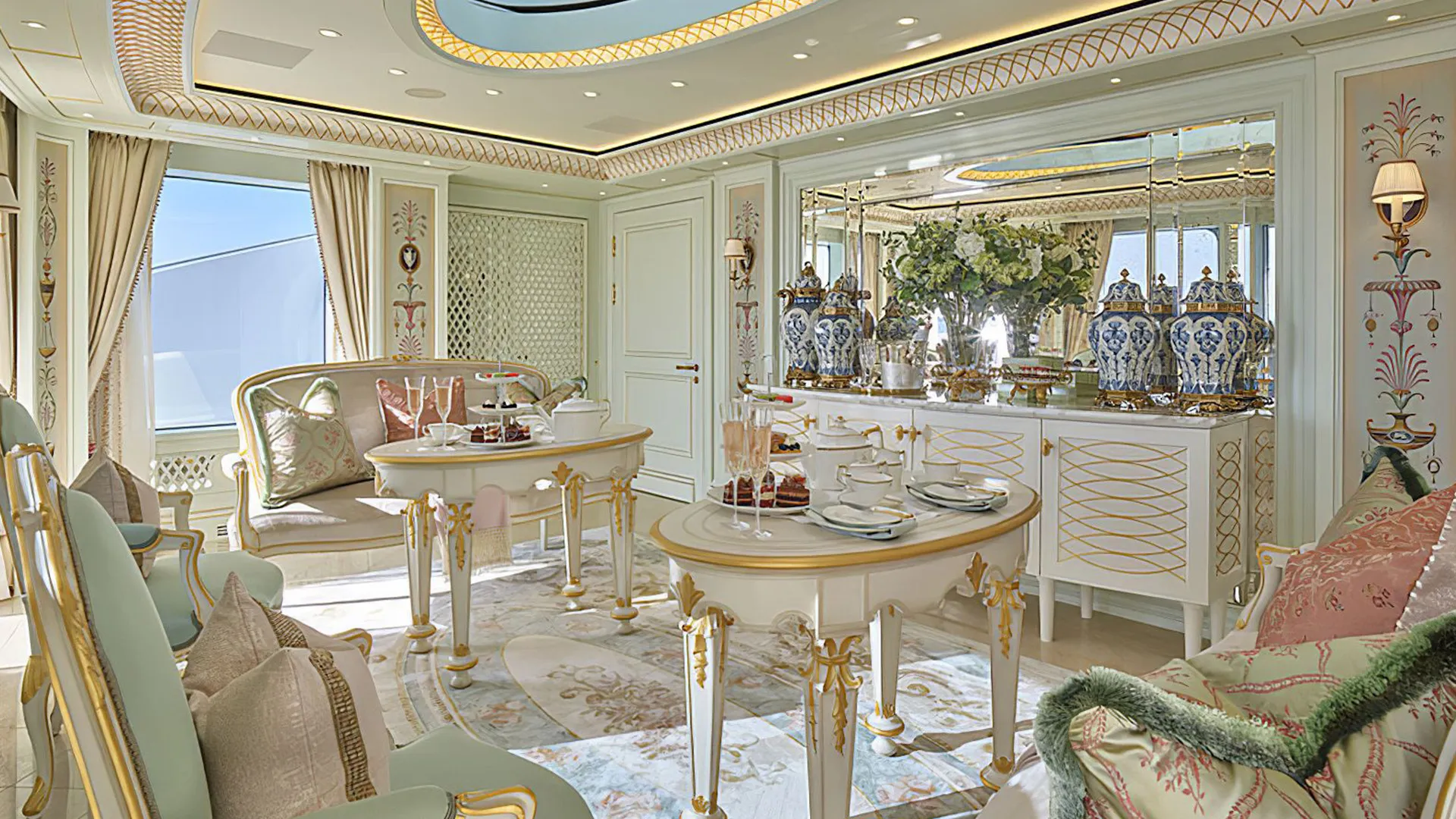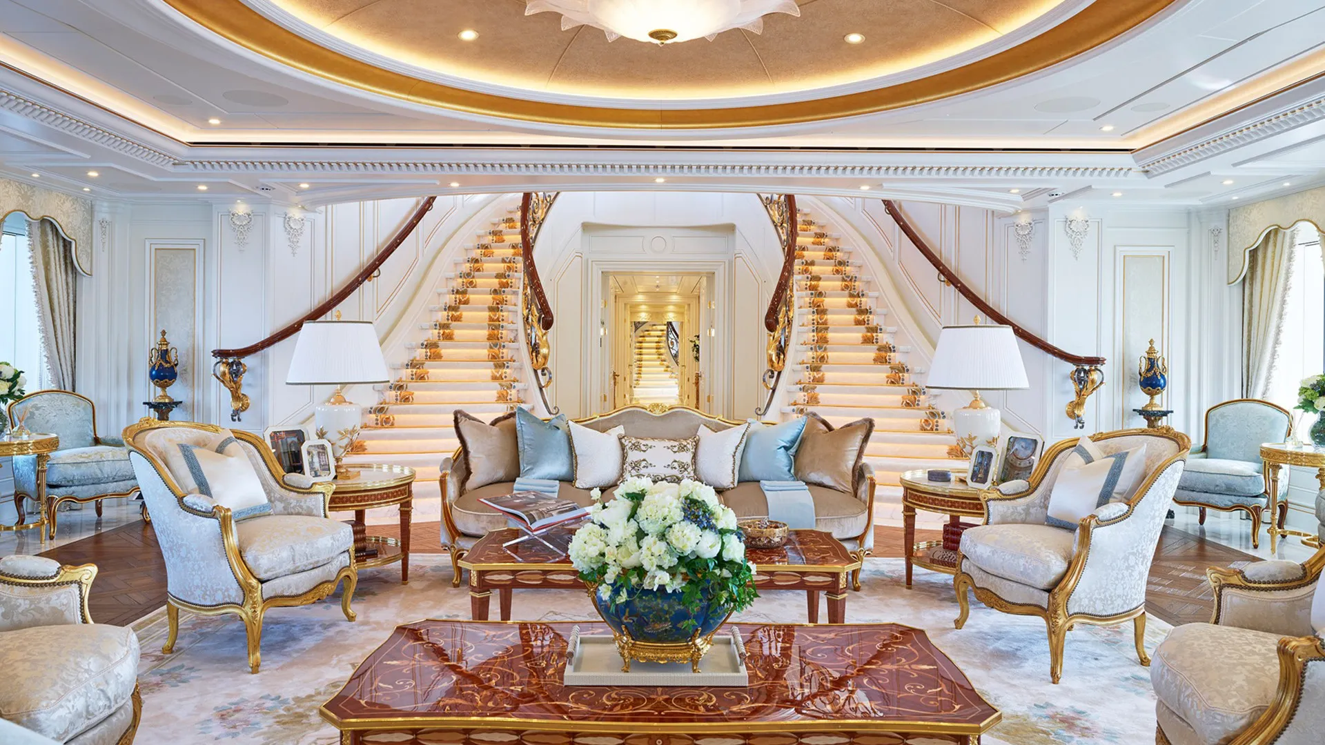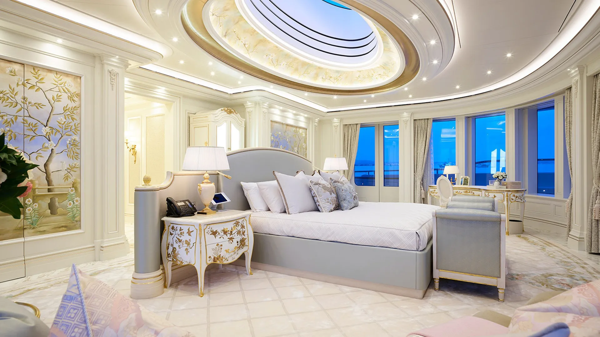 Her features include a spa, beauty salon, elevator, underwater lights, beach club, gym and air conditioning.