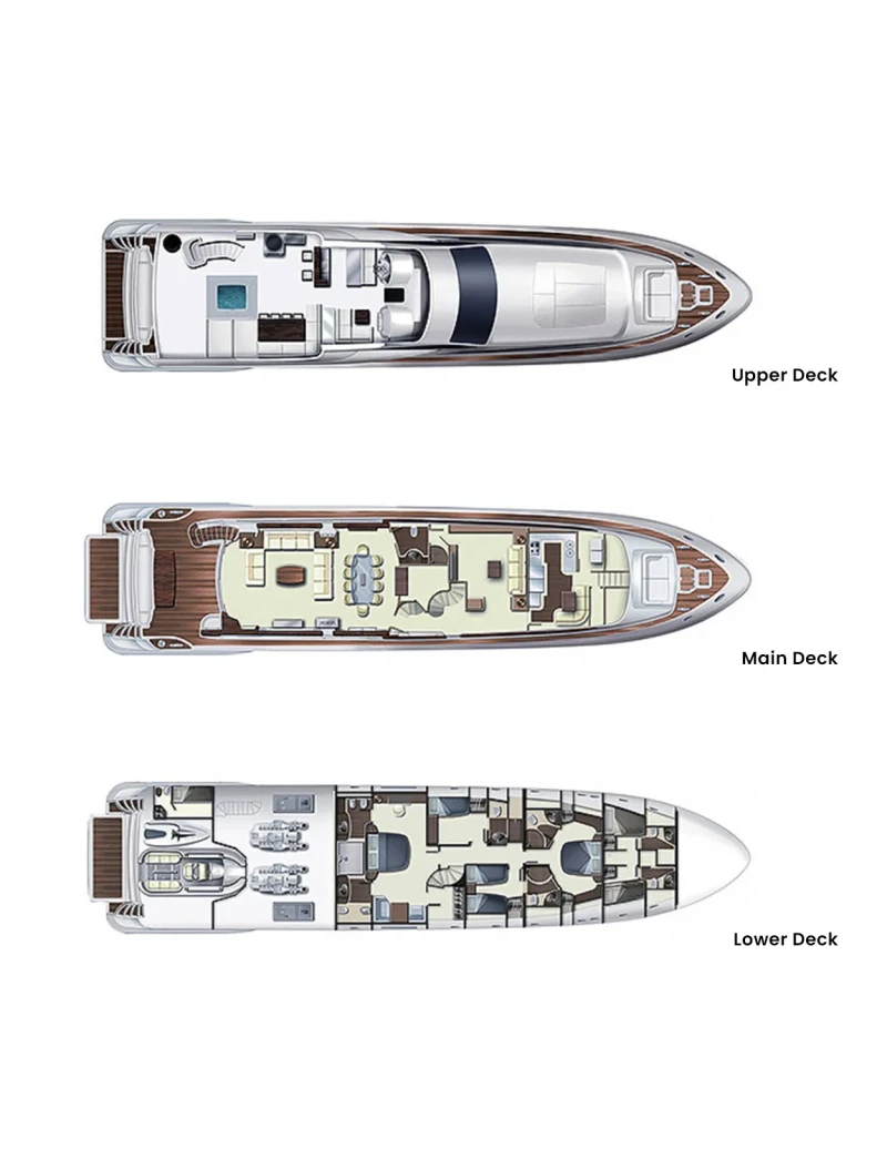 Her features include underwater lights, deck jacuzzi, WiFi and air conditioning.