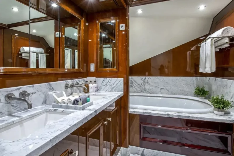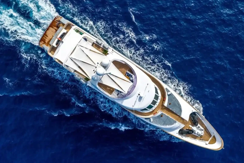 Her features include underwater lights, gym, deck jacuzzi, WiFi and air conditioning.