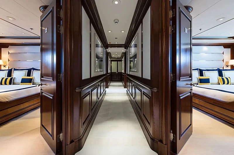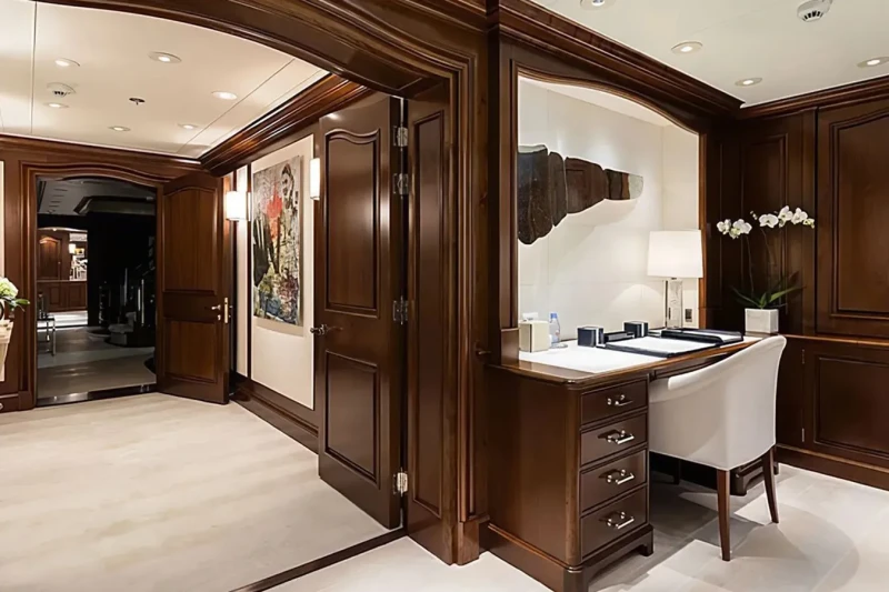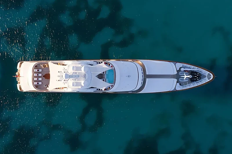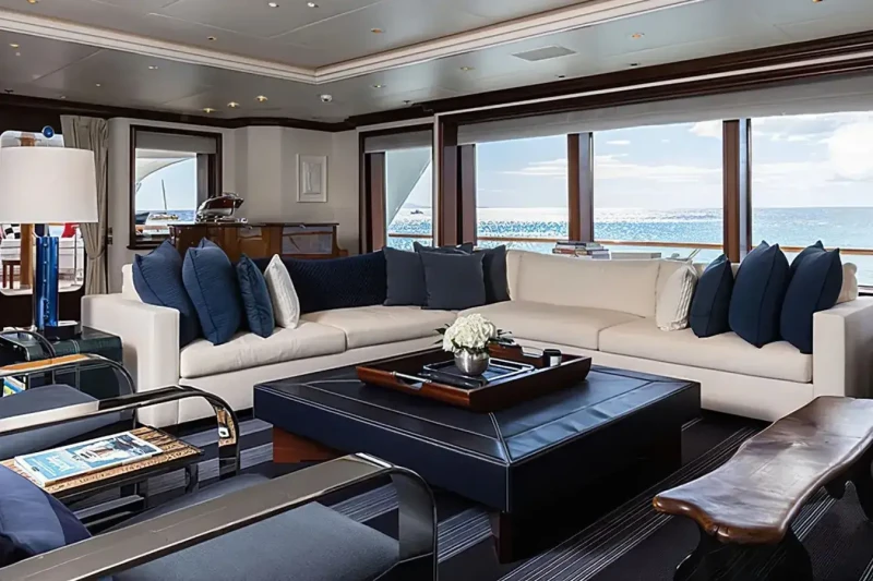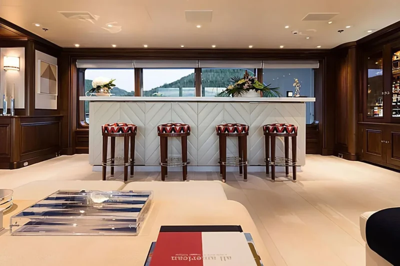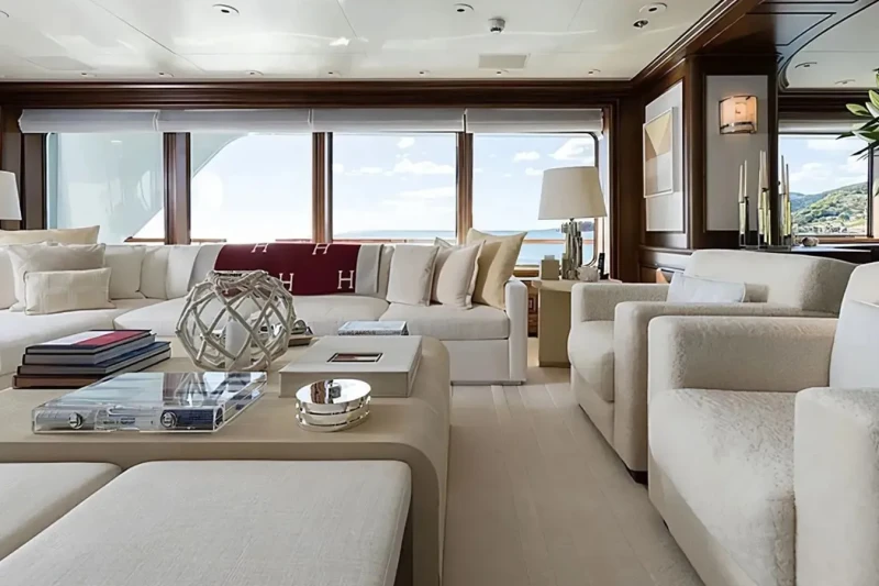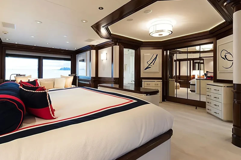 Built in 2000, Flag offers guest accommodation for up to 12 guests in 7 suites comprising a master suite and six double cabins. The supremely spacious full beam master suite incorporates its own study and dressing room as well as a his and her bathroom. The bed configuration includes 5 king, 2 queen and 2 singles. She is also capable of carrying up to 16 crew onboard to ensure a relaxed luxury yacht charter experience.