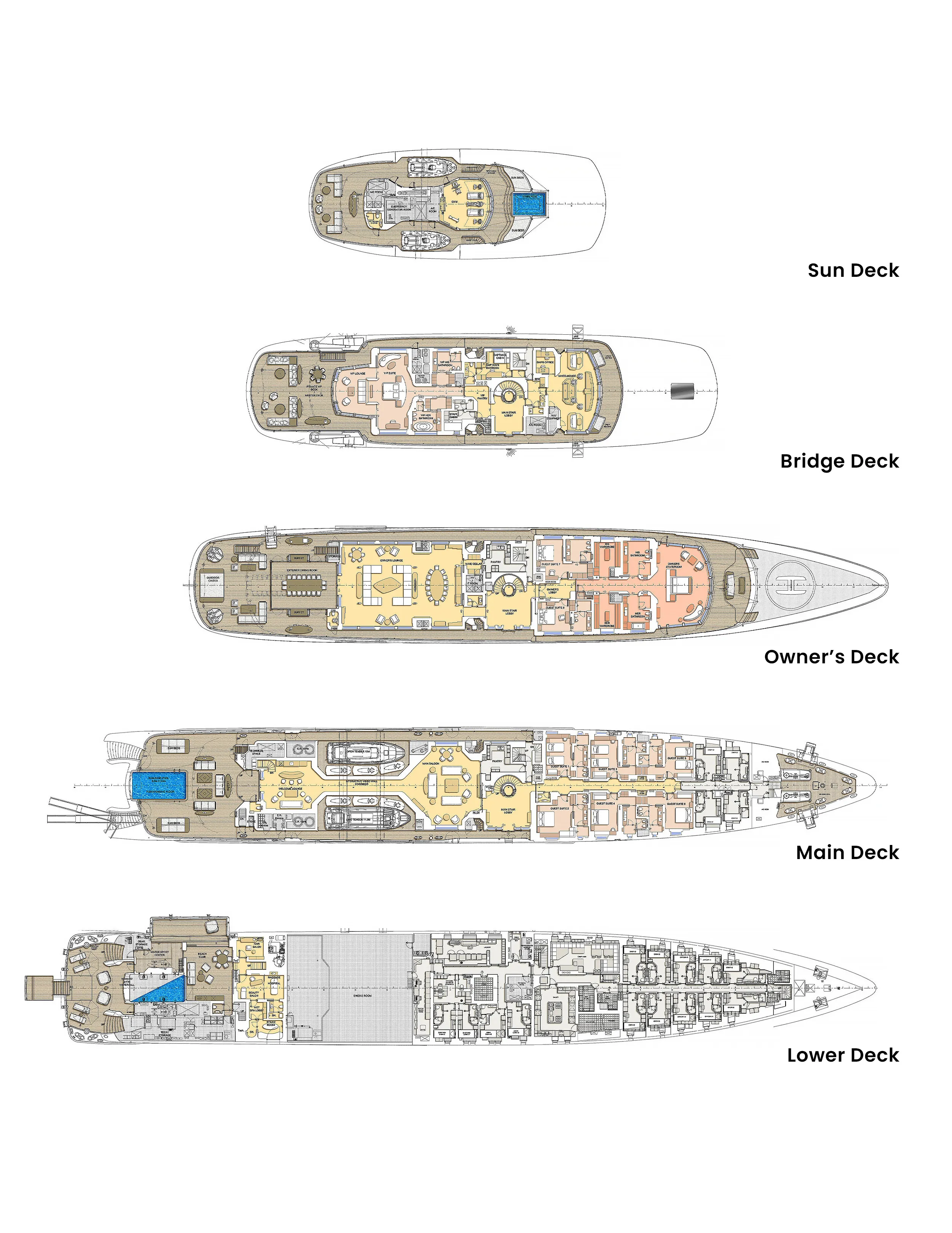Her features include conference facilities, beauty salon, spa, beauty salon, satellite communications, underwater lights, beach club, gym, deck jacuzzi, WiFi and air conditioning.