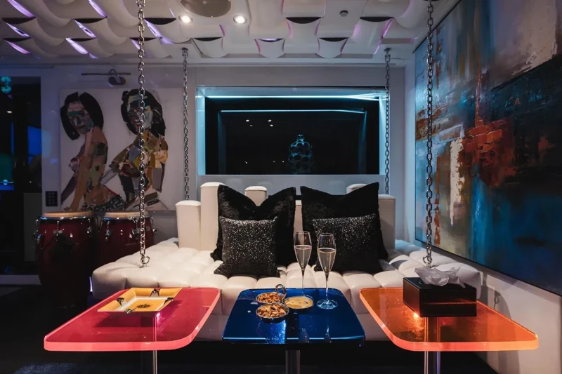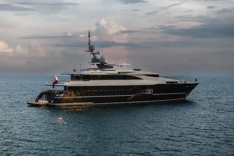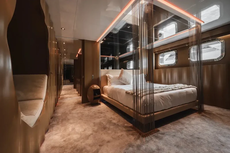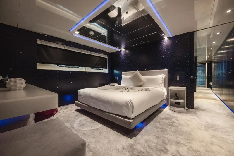 Her features include a dancefloor, movie theatre, underwater lights, gym, deck jacuzzi, WiFi and air conditioning.