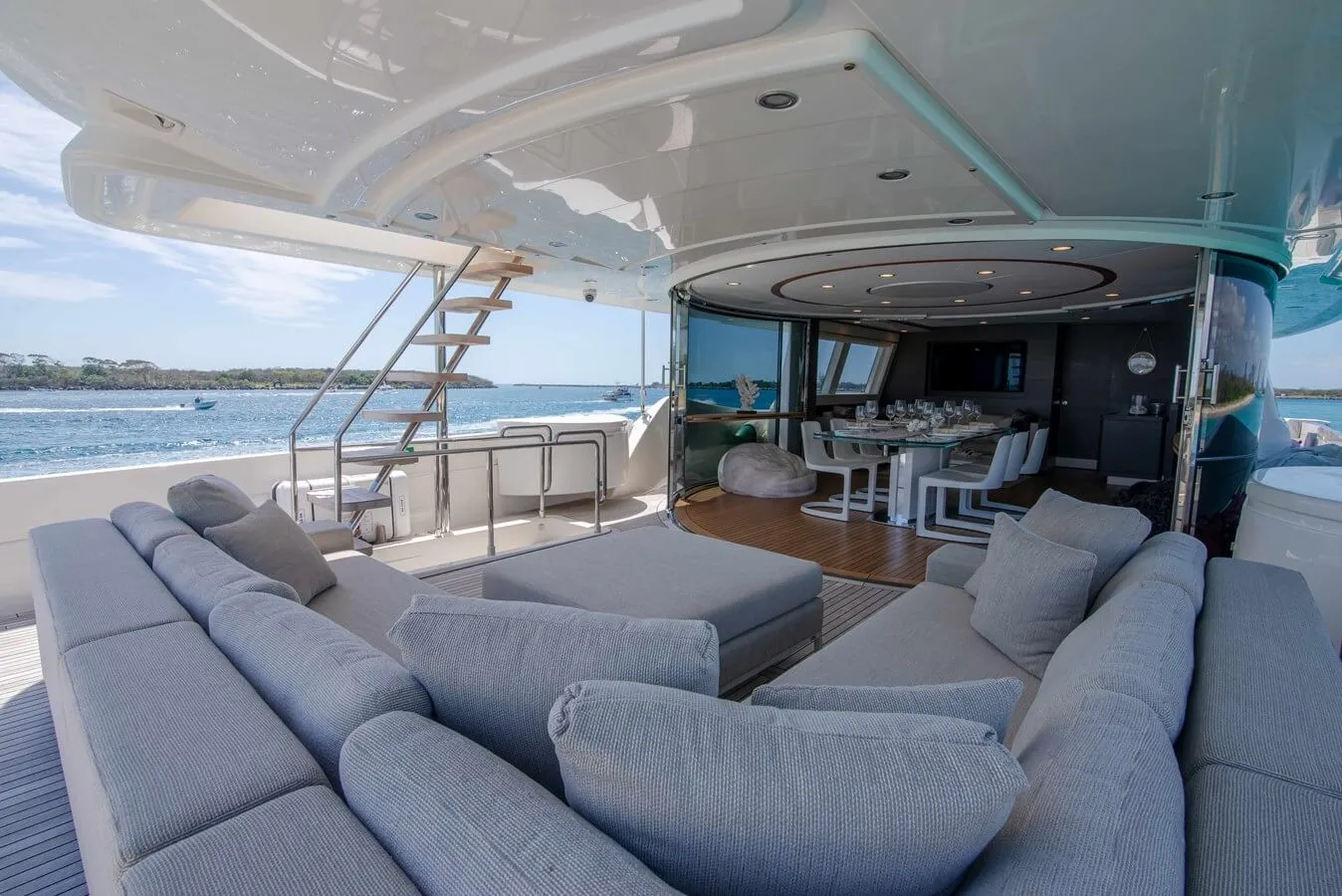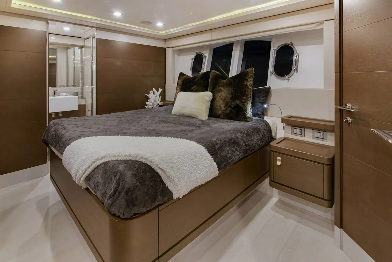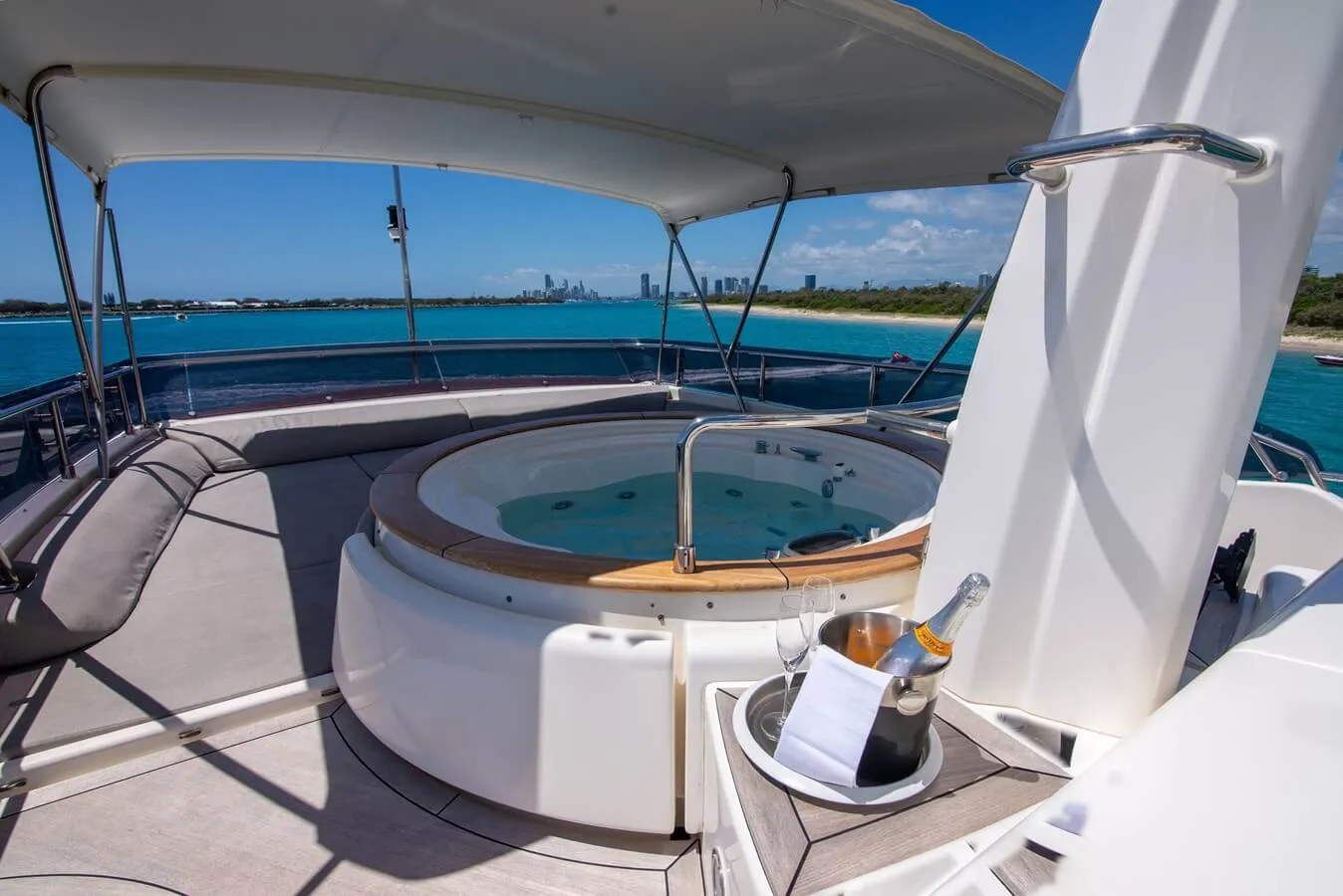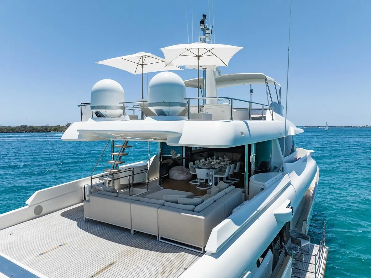 Her features include underwater lights, deck jacuzzi, WiFi and air conditioning.