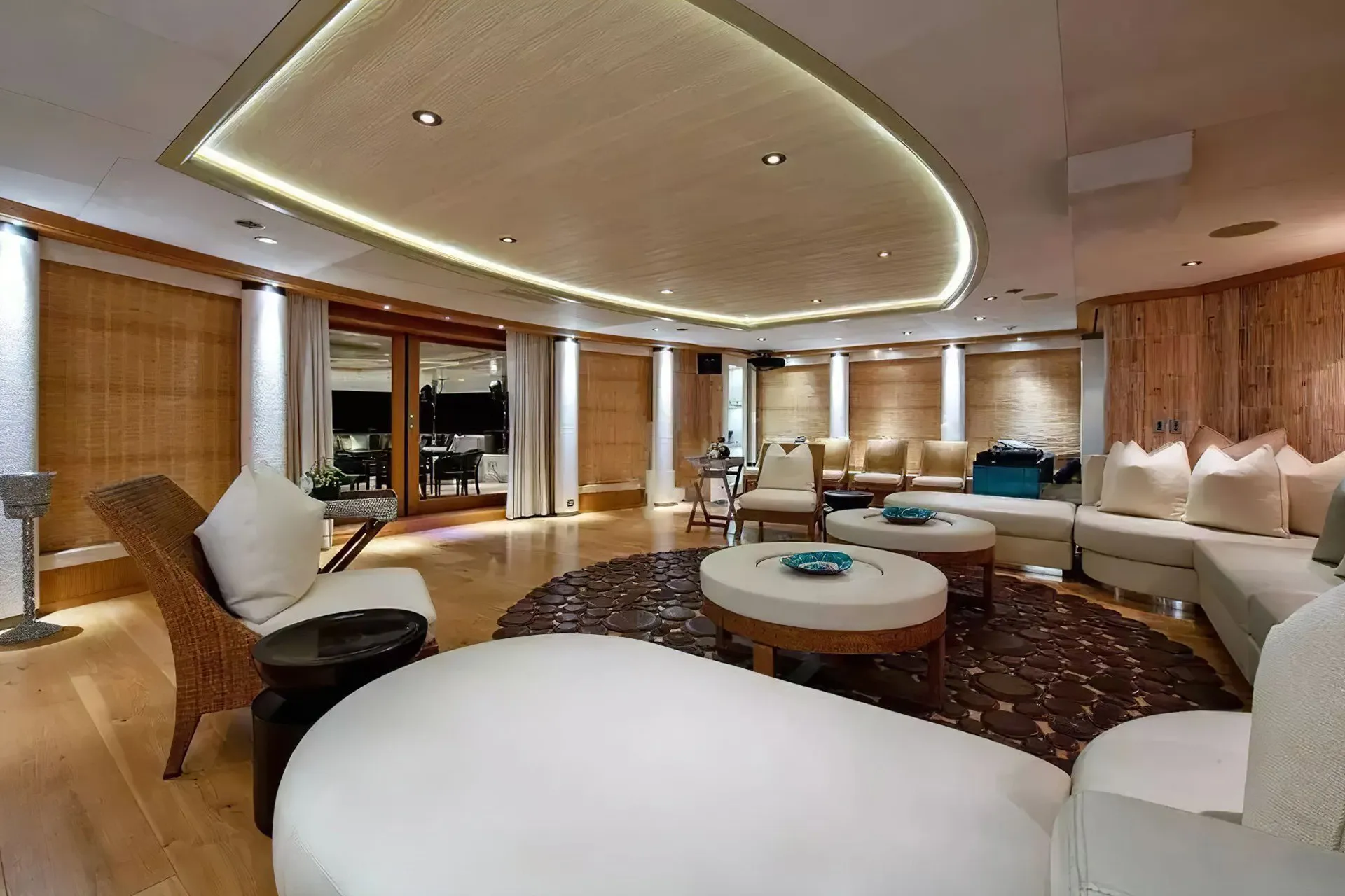 Her features include a movie theatre, beauty salon, elevator, beach club, gym and air conditioning.