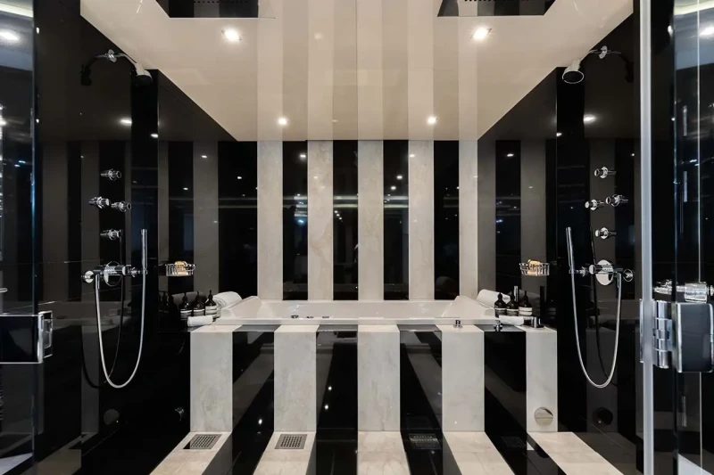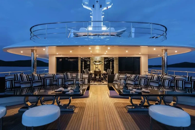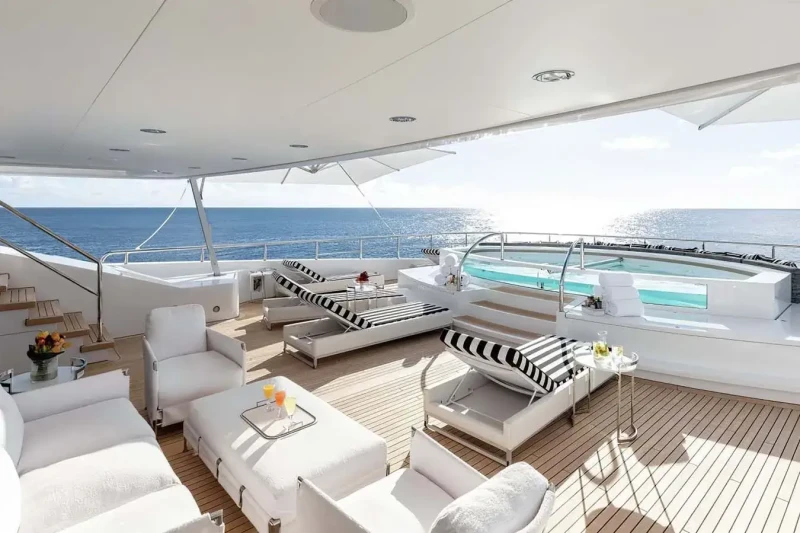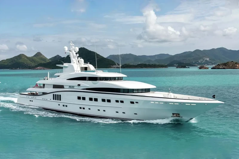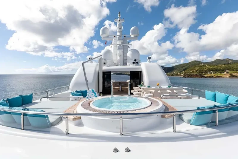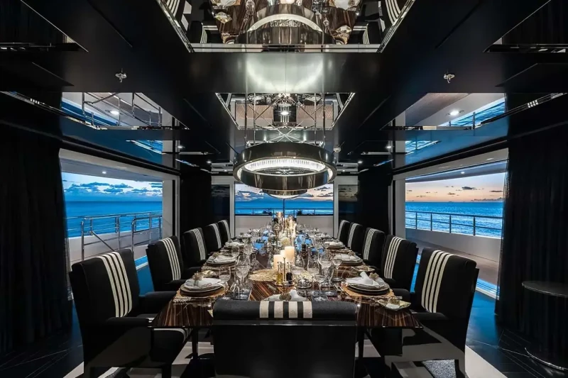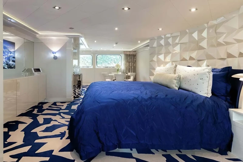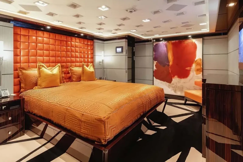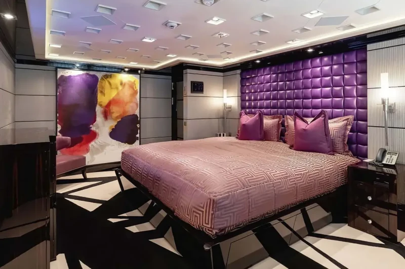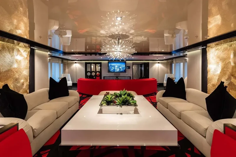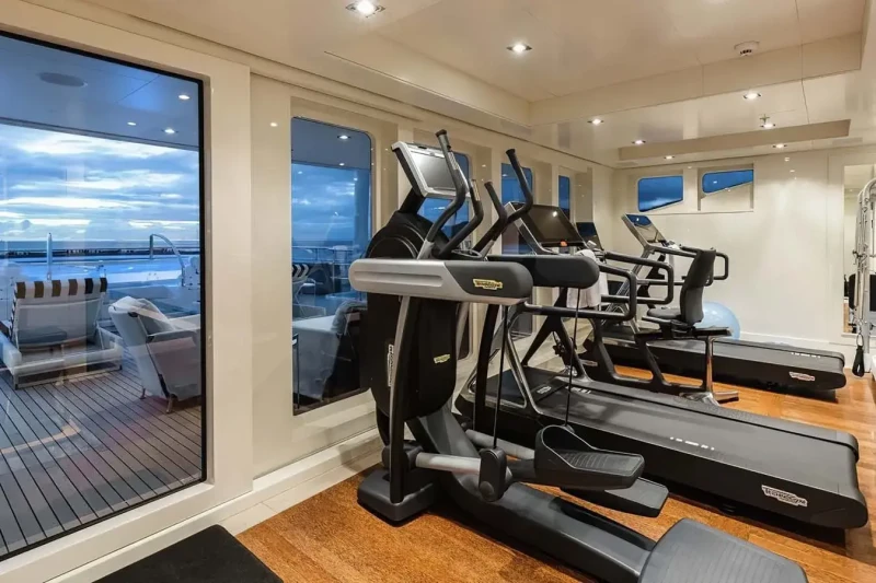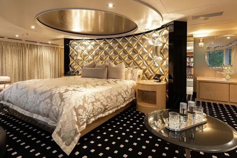 Her features include a movie theatre, elevator, underwater lights, gym and air conditioning.