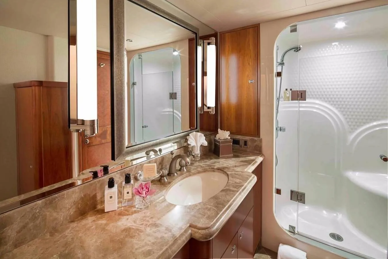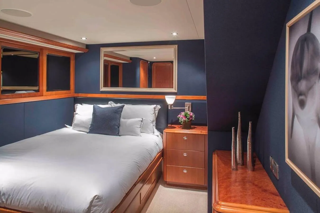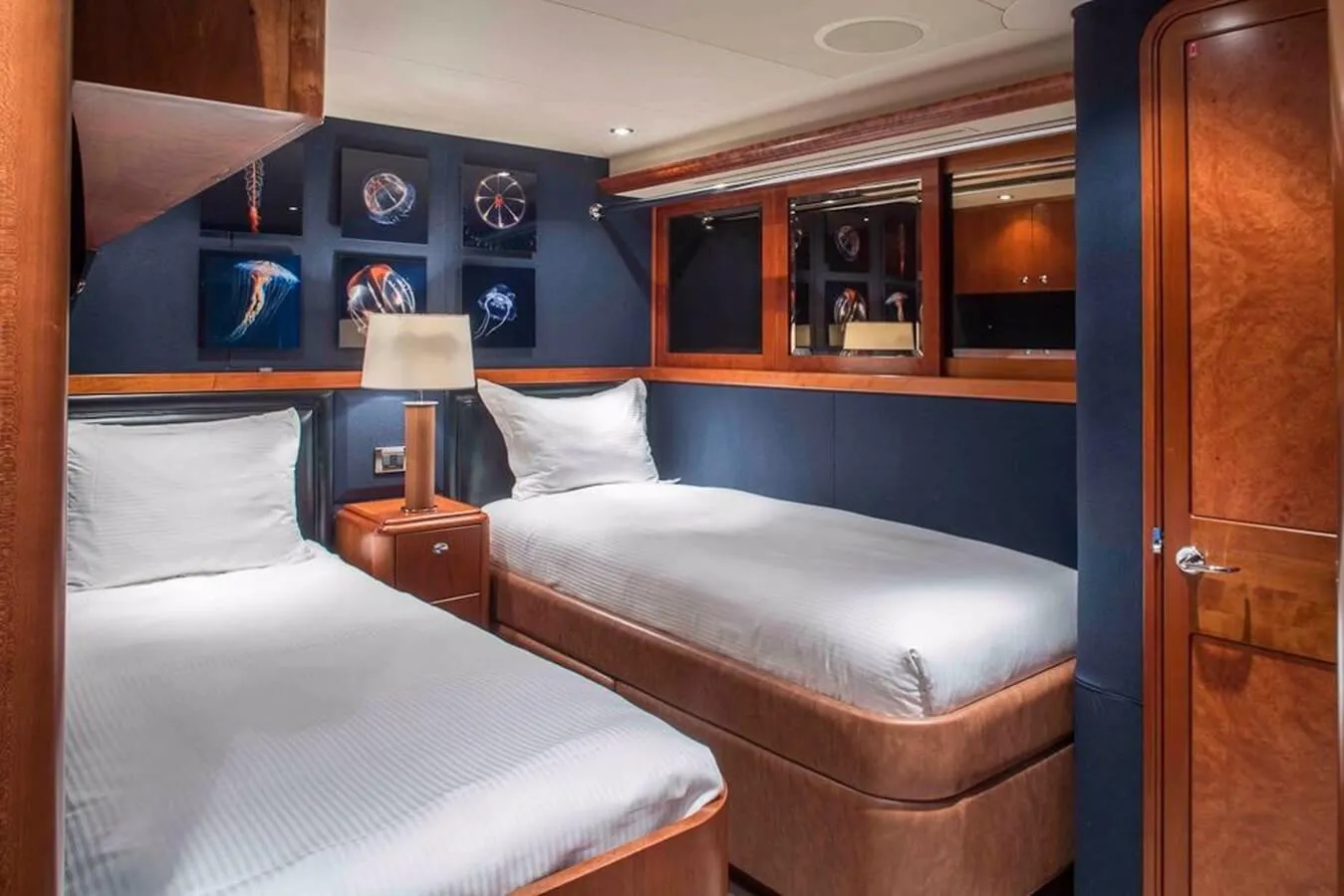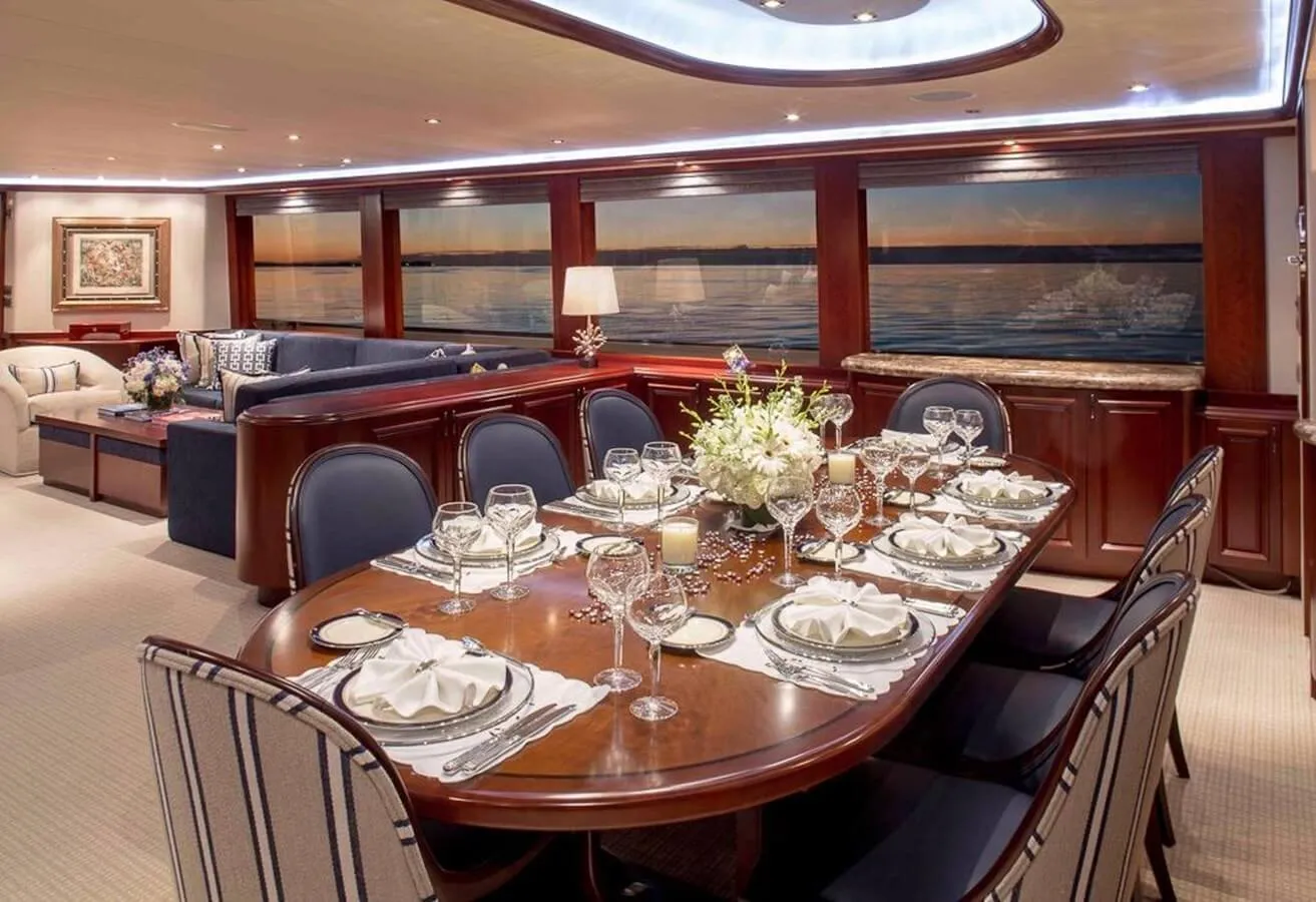 Plan A offers guest accommodation for up to 10 guests in 5 suites comprising a master suite, three double cabins and one twin cabin. The master suite features extensive storage space provided by the dressing room benefits from a his and her bathroom. There are 6 beds in total, including 3 king, 1 queen and 2 singles. She is also capable of carrying up to 8 crew onboard to ensure a relaxed luxury yacht charter experience.